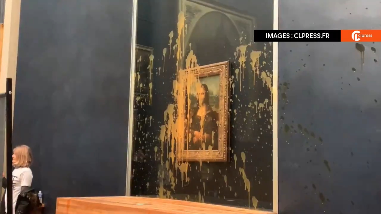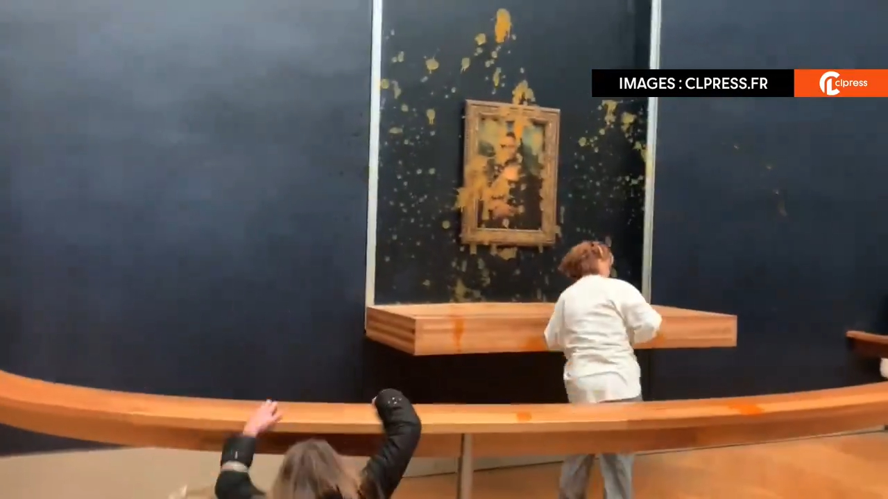 根據外媒報導,達文西巨作〈蒙娜麗莎〉又遭襲,兩名女子於28日衝進羅浮宮展區,並跨越導覽界線,毫不猶豫地將手上的南瓜湯潑向畫作,並站在畫作前輪流說道:「什麼更重要?藝術還是獲得健康和可持續食物的權利?」大聲斥責:「我們的農業系統病入膏肓,我們的農民死於工作」。