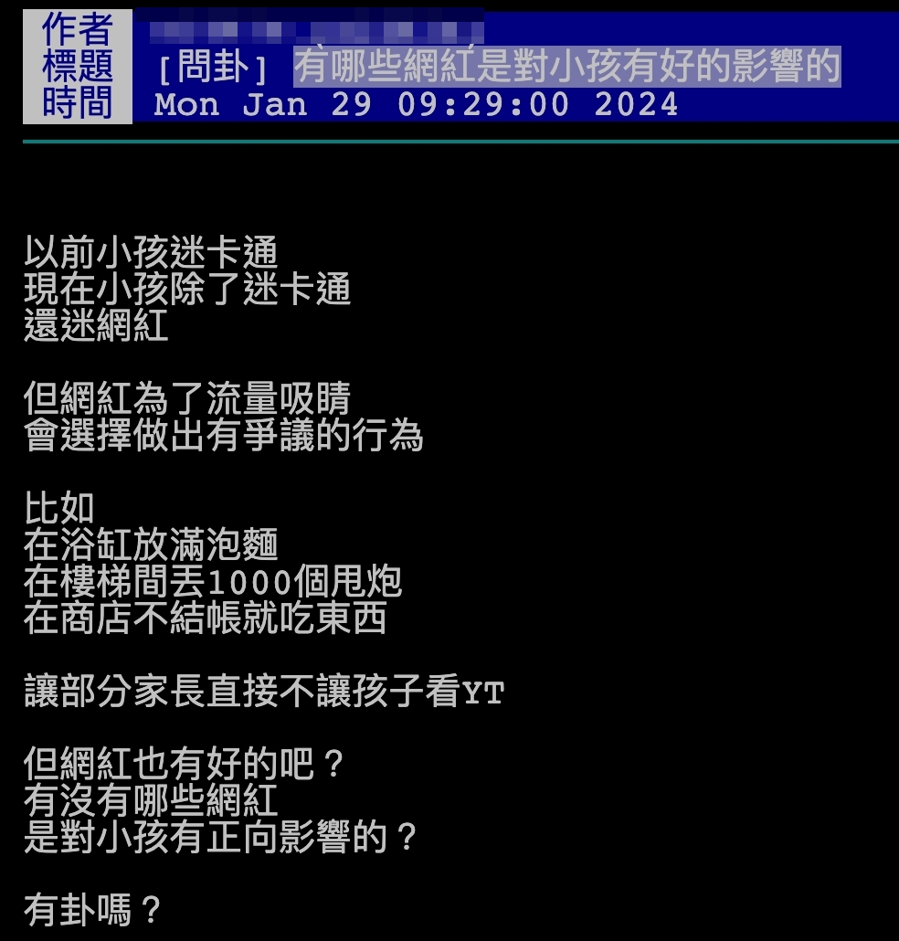 有網友在PTT發文表示:「以前小孩迷卡通,現在小孩除了迷卡通,還迷網紅,但網紅為了流量吸睛,會選擇做出有爭議的行為。」原PO舉例過去曾有人在浴缸放滿泡麵、在樓梯間亂丟甩炮,以及不結帳就吃架上商品等,許多負面教材在網路上流傳,許多家長為了不讓孩子受到負面影響,因此禁止小朋友看YouTube。