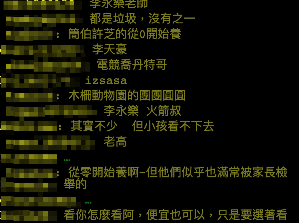 即便如此,原PO認為一定有好的網紅,並詢問:「有沒有哪些網紅是對小孩有正向影響的?」大家紛紛表示:「李永樂老師」、「好味小姐」、「健人蓋伊不錯吧,上部影片教急救,這禮拜反詐騙宣導。」還有人推薦昆蟲老西、HOOK、志祺、游庭皓等人。其中最多人推薦的就是寵物頻道「簡伯許芝」,能夠讓孩子更了解動物。