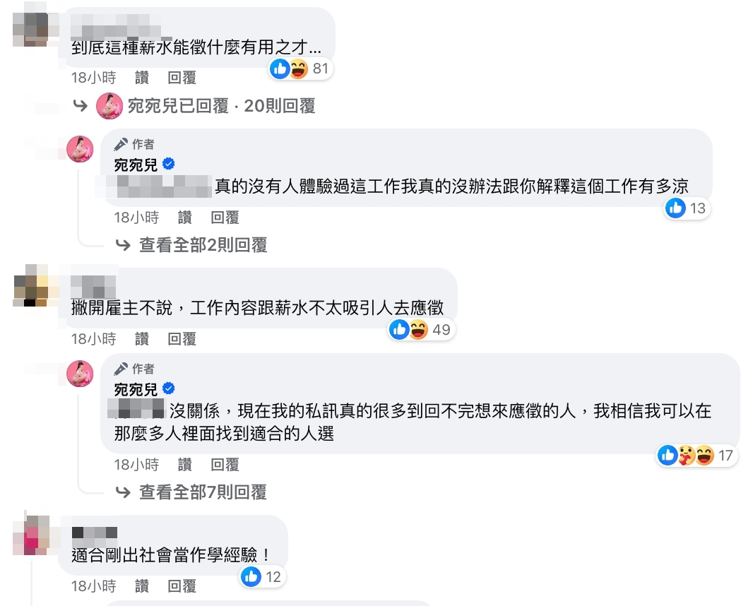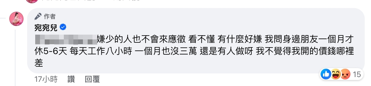 資訊曝光後,部分網友表示:「到底這種薪水能徵什麼有用之才」、「月薪起碼5萬起跳吧」、「工作內容跟薪水不太吸引人去應徵」、「說真的這個薪水真的蠻低的」、「才3萬⋯⋯照顧一個巨嬰」。對此,宛宛兒不滿表示:「現在的人就是這樣,沒什麼技能就要求一堆,嫌錢少,沒來做過哪知道工作內容是什麼,就在那講些廢話,白眼翻個3650圈!」