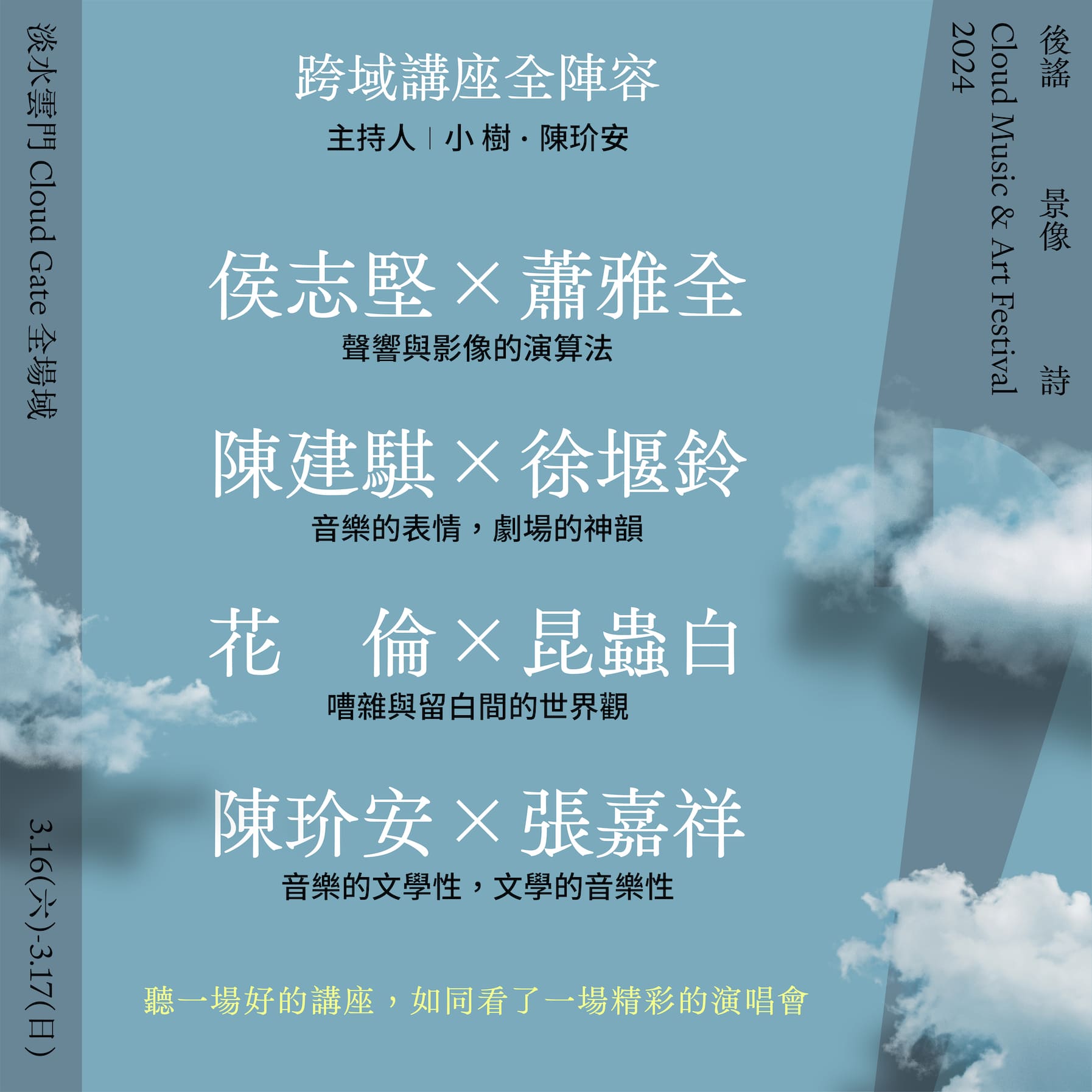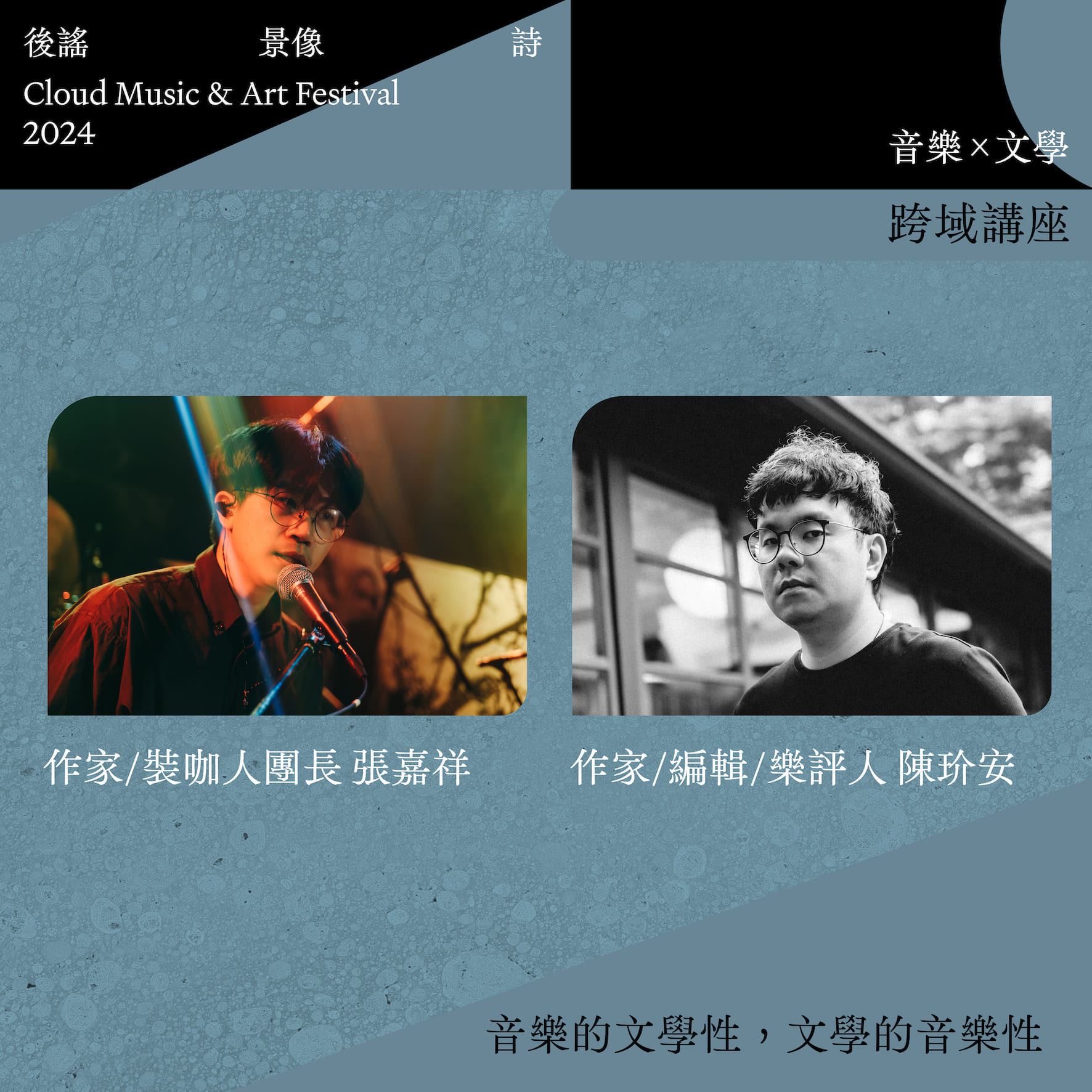 資深樂評人、作家與出版品編輯陳玠安與樂團「裝咖人」團長、獲 2023 年臺灣文學金典獎的張嘉祥,將以《音樂 X 文學:音樂的文學性,文學的音樂性》為主題,聊那些他們所觀察到的,在音樂中的文學性及實驗性。在電影、劇場與文學之外,跨域講座針對活動核心「後搖滾」,邀請兩地樂團代表花倫與昆蟲白首度同台,由陳玠安主持《兩地後謠聲景:嘈雜與留白間的世界觀》場次,聊聊玩器樂搖滾的內心話。