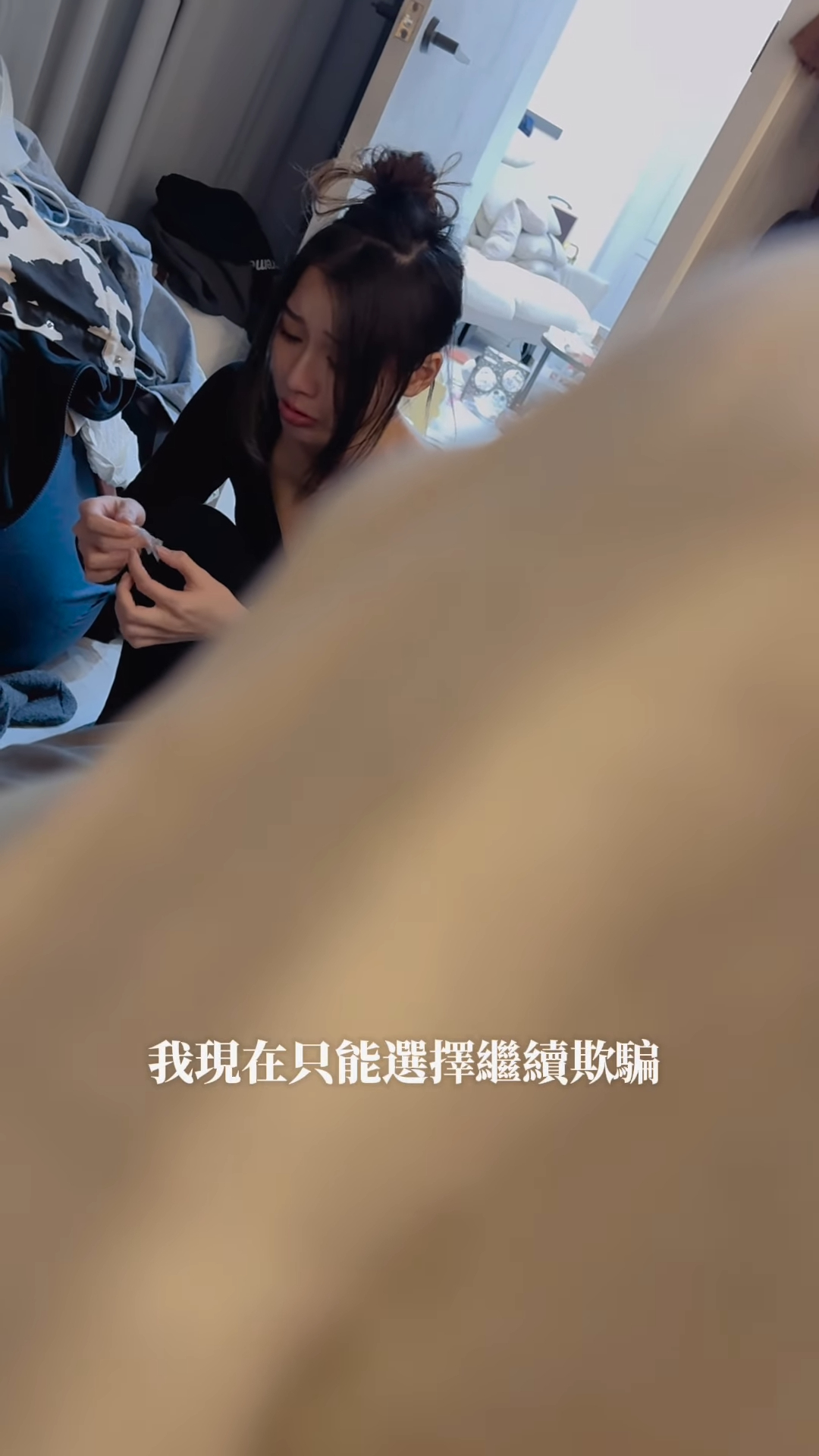 酷炫4日在IG上傳一段偷拍柔柔的影片,只見她哽咽質問:「你幹嘛帶保險套?」他見狀心疼表示:「看到她哭我真的很不捨,早知道我不該這樣做,但要繼續這段感情,我現在只能選擇繼續欺騙。」他只好解釋因為去年運勢不好,為了「招財」才隨身攜帶保險套。