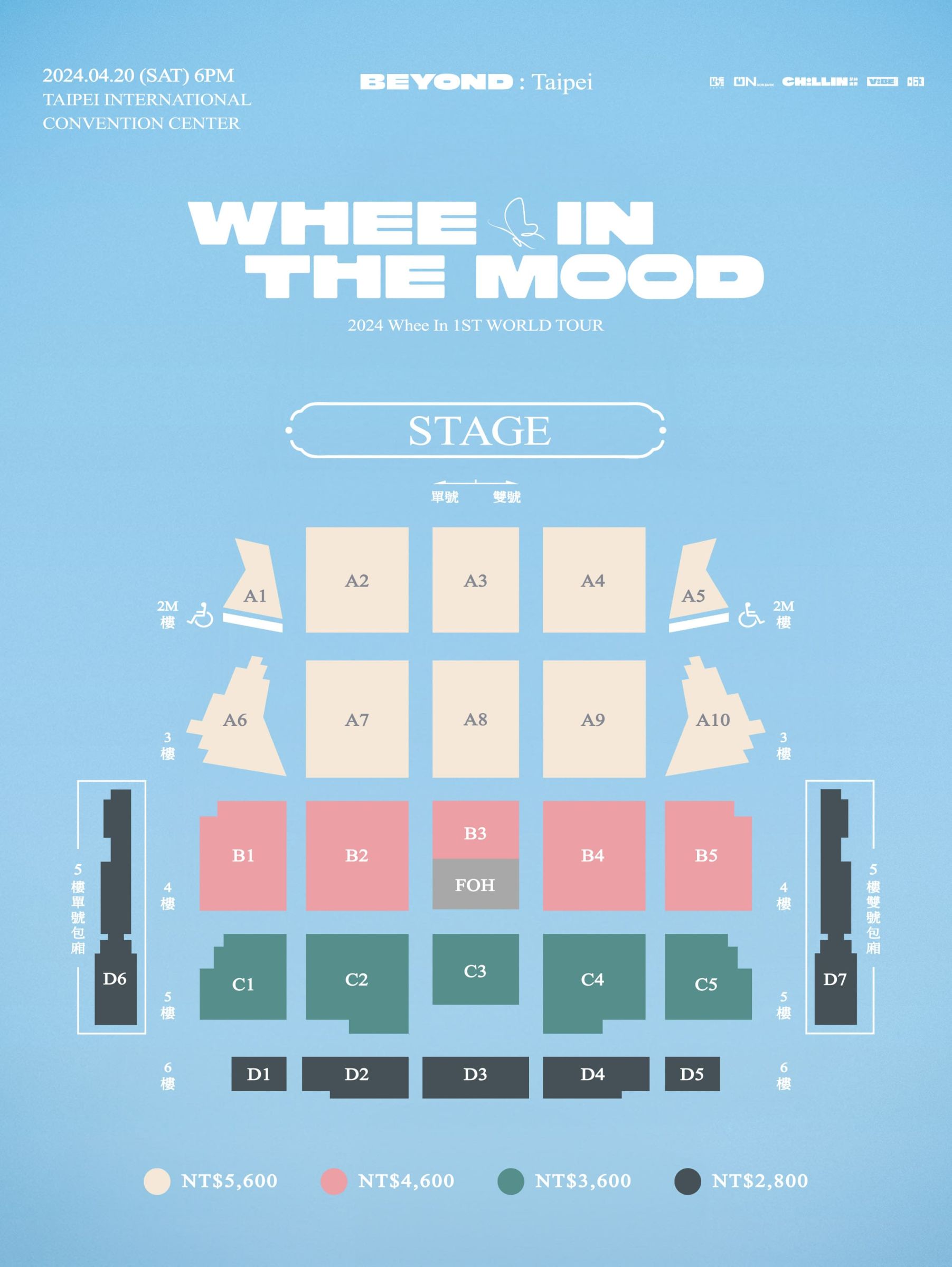 譽為 vocal 女王的音源強者輝人,迎來十年音樂生涯中,首次獨自登台的世界巡迴演唱會《2024 Whee In 1ST WORLD TOUR: WHEE IN THE MOOD [BEYOND] IN TAIPEI》,將於 2024 年 4 月 20 日 (六) 在 TICC 臺北國際會議中心舉辦,憑藉獨特嗓音和出色的唱功讓全臺 MOO MOO (粉絲名) 激動期待。演唱會活動門票將於 2 月 18 日 (日) 中午 12 點在 KKTIX 網站開賣,全場實名制購票,演唱會票價為 NT$5,600 / NT$4,600 / NT$3,600 / NT$2,800,凡於 3 月 31 日前購票者,有機會使用一元加購 1:1 合照、會後歡送、1:10 團體合照、親筆簽名海報及親筆簽名小卡等福利。2 月 15 日 中午 12:00 之前免費註冊成為希林希波會員,更享有前一天優先購票權利, MOO MOO 們請到希林國際臉書粉絲專頁查看詳情。
