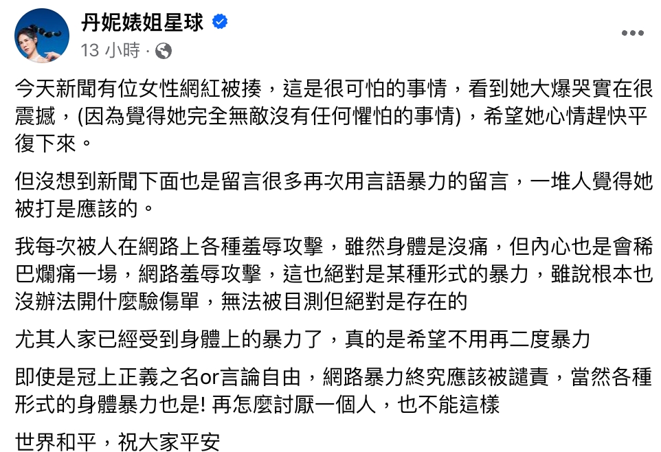丹妮婊姐認為當事人已經受到身體上的攻擊,希望大家不要造成二度傷害,「即使是冠上正義之名or言論自由,網路暴力終究應該被譴責,當然各種形式的身體暴力也是!再怎麼討厭一個人,也不能這樣。」貼文曝光後,大家紛紛表示:「婊姐真的很善良,沒有因為她批評過妳就落井下石」、「三觀非常正確!」、「完全以德報怨,是我是完全不會同情這個人。」