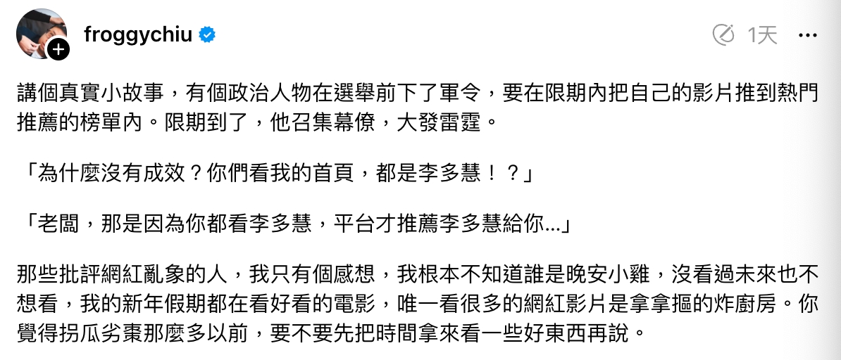 晚安小雞的作為引起一片罵聲,呱吉對此在Threads發表個人觀點,舉例有位政治人物要求選前將自己的影片推到熱門榜單,但期限到了之後卻沒有效果,他因此火大斥責:「為什麼沒有成效?你們看我的首頁,都是李多慧!?」幕僚則回應:「那是因為你都看李多慧,平台才推薦李多慧給你。」呱吉表示自己在事件發生之前,完全不知道晚安小雞是誰,並直言:「你覺得拐瓜劣棗那麼多以前,要不要先把時間拿來看一些好東西再說。」