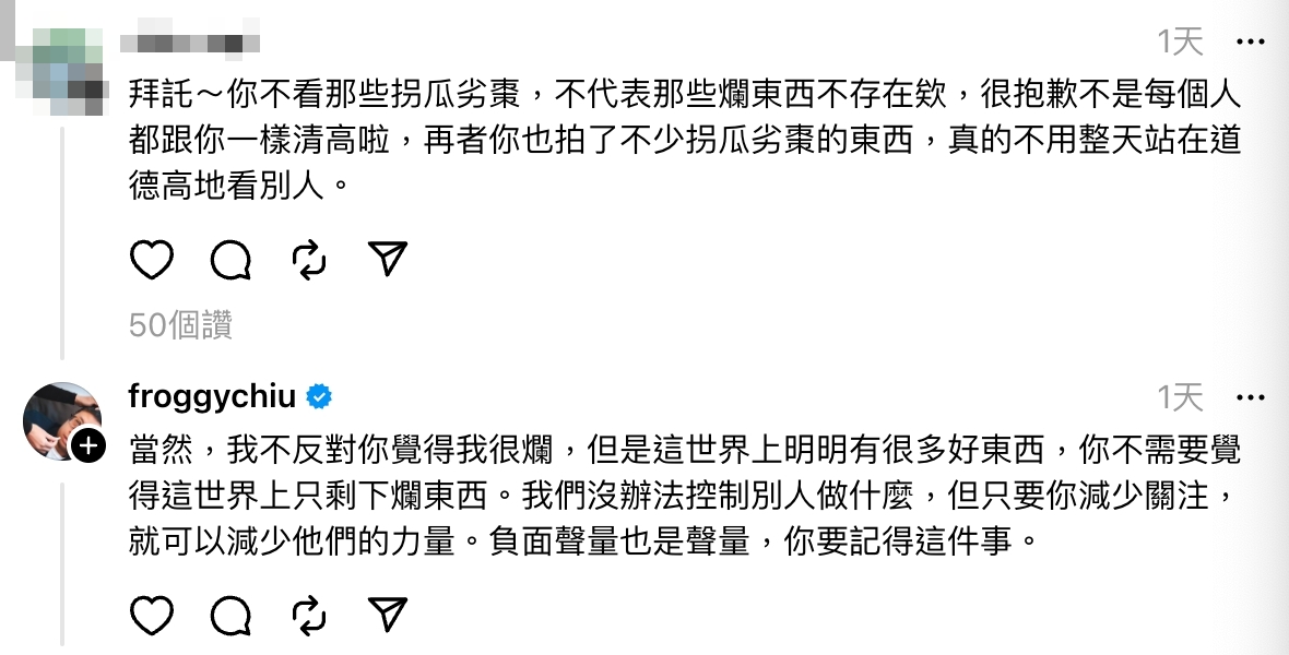 也有網友不滿回嗆:「你不看那些拐瓜劣棗,不代表那些爛東西不存在欸,很抱歉不是每個人都跟你一樣清高啦。」更指出呱吉拍了很多拐瓜劣棗的東西,不需要站在道德高處看別人。呱吉尊重原PO的想法,但強調:「我們沒辦法控制別人做什麼,但只要你減少關注,就可以減少他們的力量。負面聲量也是聲量,你要記得這件事。」