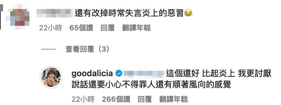 貼文曝光後,有網友無情吐槽:「還有改掉時常失言炎上的惡習」,愛莉莎莎則回應:「這個還好,比起炎上,我更討厭說話還要小心不得罪人,還有順著風向的感覺。」有些人欣賞她的做法,選擇力挺,但也有人無法接受,留言區戰成一片。