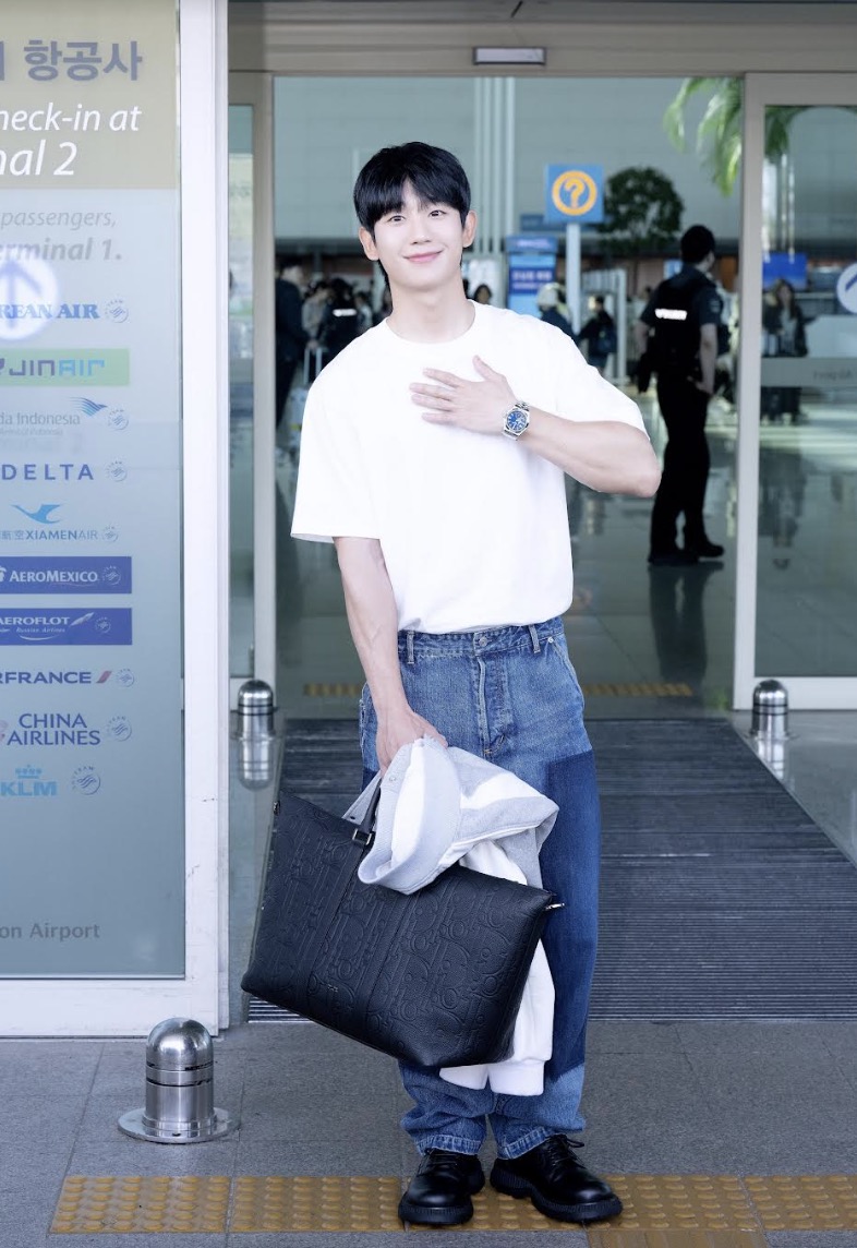 Dior韓國品牌大使丁海寅為新片《I, The Executioner》將於第77屆坎城影展午夜展映(Midnight Screening)試映,稍早以全身Dior的造型現身韓國仁川機場準備前往坎城。 丁海寅選擇Dior鈴蘭花圖騰白色T恤搭配丹寧工裝長褲與Dior Buffalo德比鞋,手上搭襯最新的Dior黑色Weekender 40 Gravity皮革旅行包,信手捻來就是簡約率性風格。