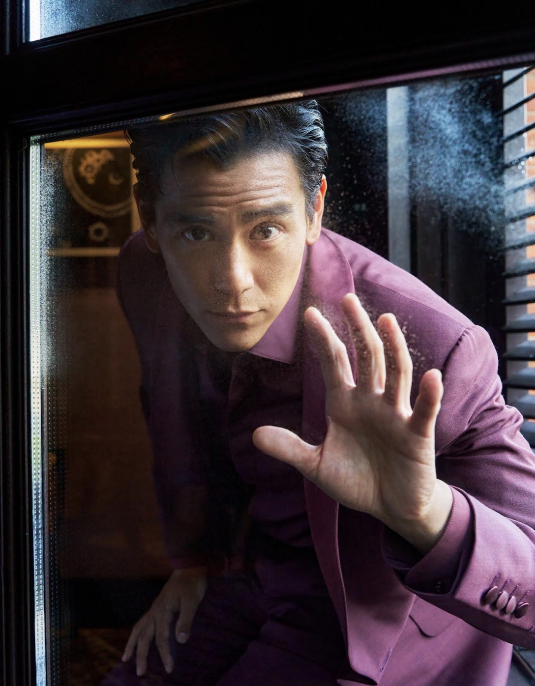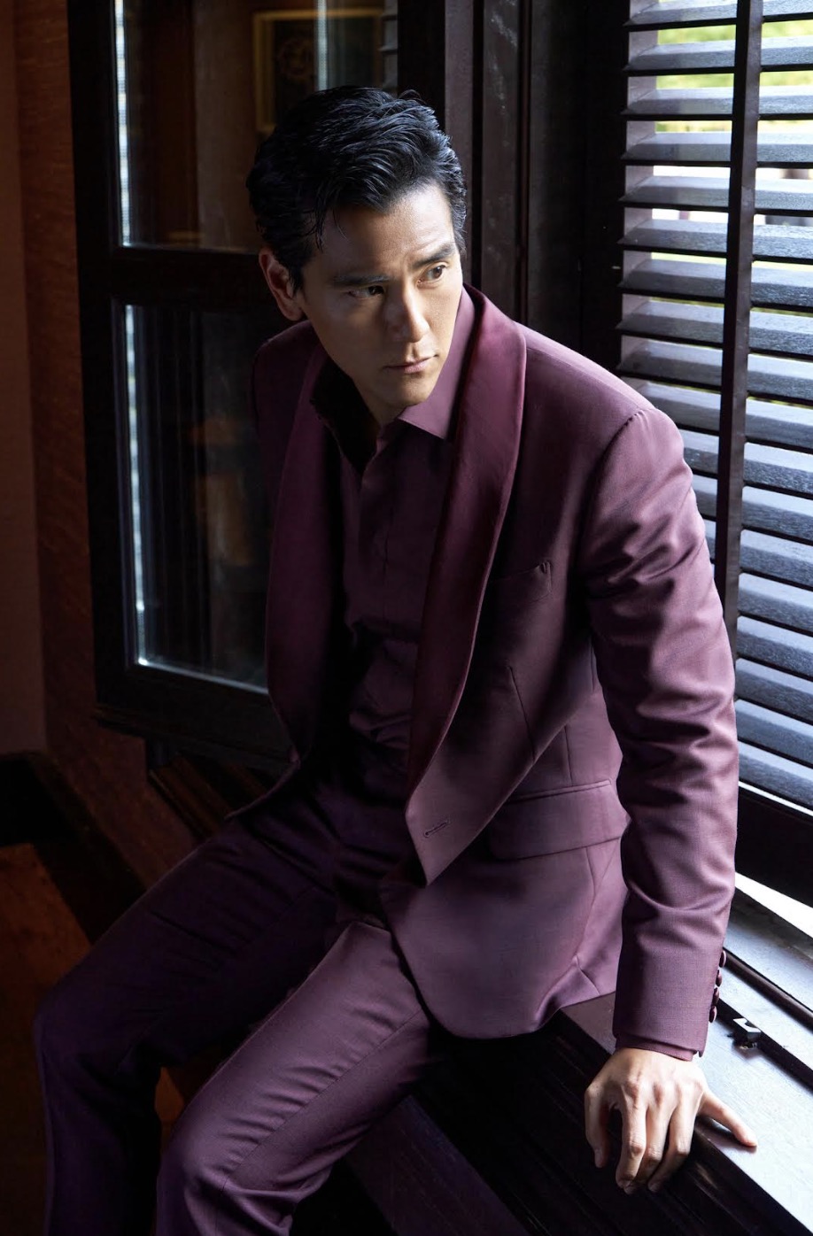 知名演員彭于晏身穿Berluti酒紅色馬海毛禮服出席第26屆上海國際電影節。禮服上的緞面青果領設計,搭配酒紅色襯衫,完美展現出高貴的風範。