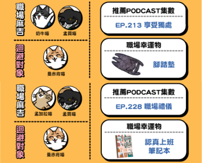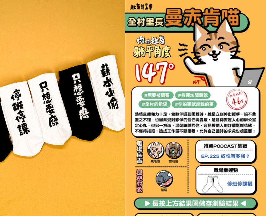 出社會的人類們必聽的Podcast【社畜請上車】,是一個輕鬆聊職場、生活、感情話題的Podcast頻道,為了能更加貼近大家的生活,在7月初推出一檔以【你的社畜躺平角度】為主題的心理測驗,除了測驗你的工作性格,同時還包含多種心理狀態,例如#拜託不要打電話給我、#我這麼可愛為什麼要上班,用有趣又輕鬆的方式,暢談職場上的人格,超級有共鳴,吸引許多社會人士瘋傳~其中,最吸睛的就是16隻貓咪類型!到底有哪16隻貓咪呢?一起來看看吧!
