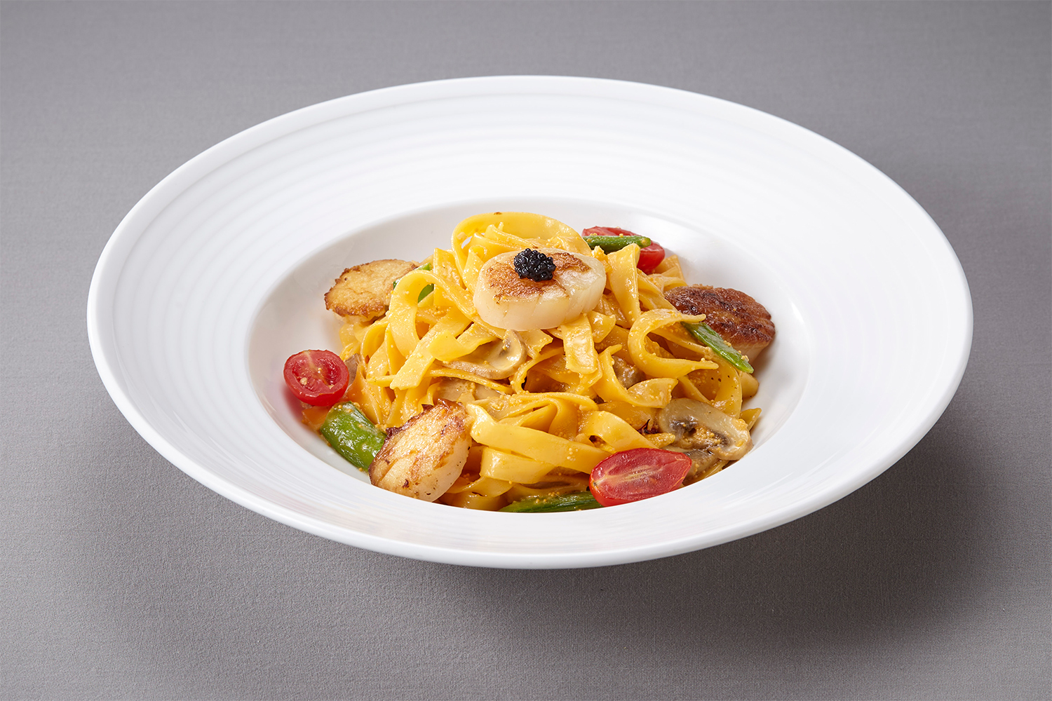 干貝海膽奶油寬卷麵,一顆顆渾圓飽滿的生食級干貝,是每日主廚親自監督嚴選,大小重量皆須符合統一規格,奶油融合海膽醬的創新風味,降低白醬奶香味,由充滿海洋鹹香的口感取代,帶來不同凡響的義大利麵口感。