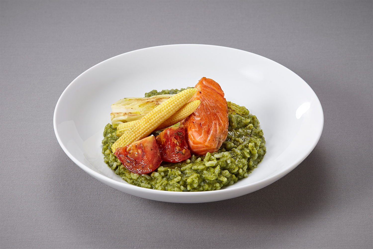 挪威鮭魚青醬燉飯,主廚每日使用羅勒葉現打青醬,不添加其他添加物,用最天然原始的食材,征服饕客的心。採用「2015米蘭世界博覽會」選用唯一的義大利米代表品牌,百年老字號品牌,更是如今義大利市占率最高的白米品牌,讓每一口燉飯,都能感受主廚對料理的用心。