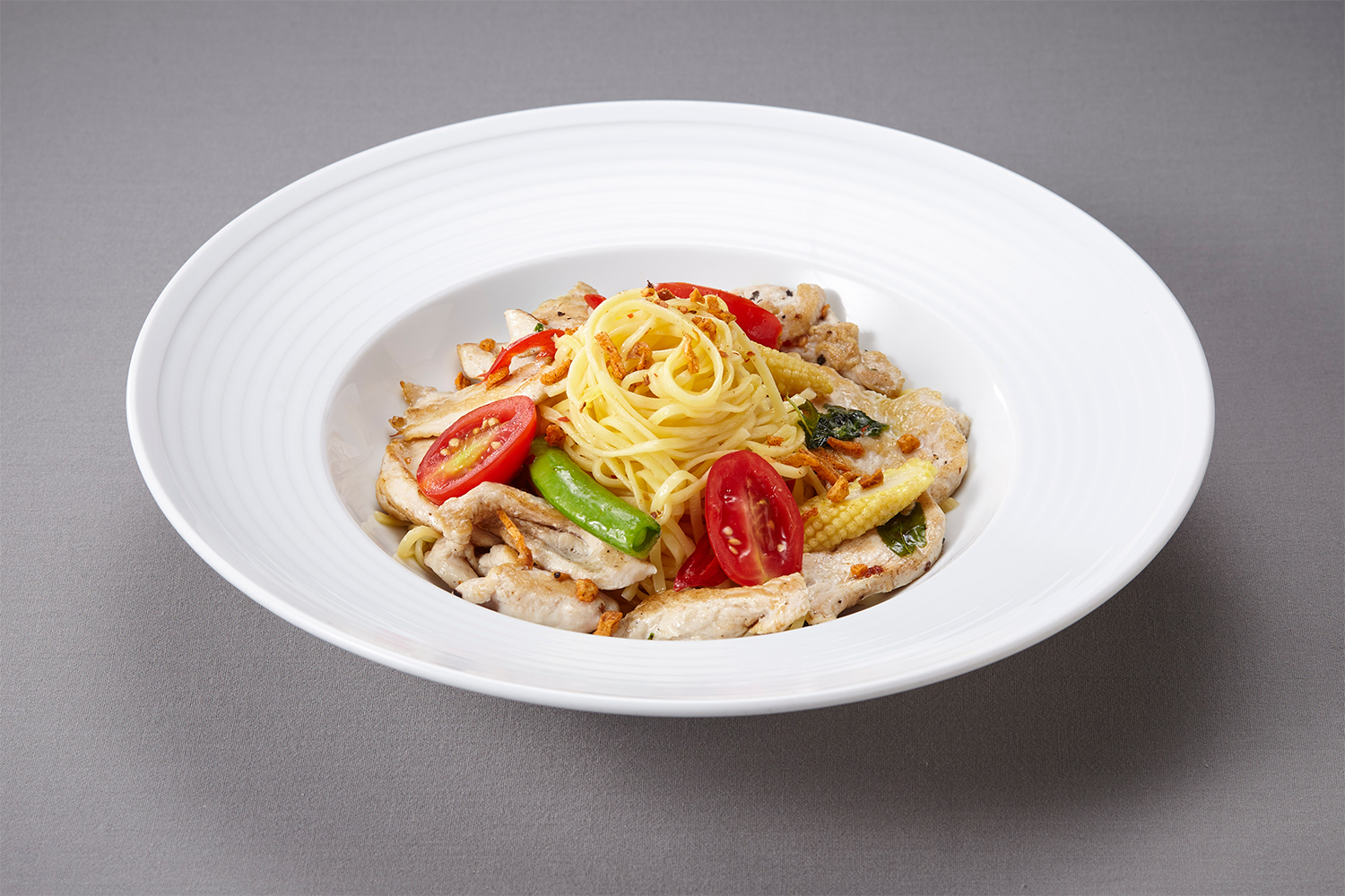 香蒜辣雞肉細扁麵,採用地中海區域的杜蘭小麥義大利麵,其蛋白質含量高,具高膳食纖維特性,更是中低升糖澱粉,有助維持新陳代謝功能穩定,而且杜蘭小麥義大利麵,能吸附更多醬汁,提升口感和風味,展現團隊對美味和健康的用心。