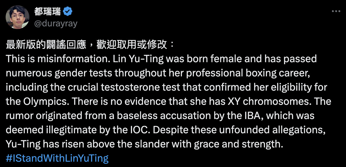 隨後阿滴也不斷以英文留言,在X上回覆外國網友的各種不實指控,針對仍有酸民發文表示林郁婷並非女性,阿滴再次力挺:「林郁婷出生就是女性,並通過多項性別測試,包括獲取奧運資格的睪固酮測試。沒有證據表明她有 XY 染色體,且國際奧委會也認為IBA的不實指控是非法的。」並建議若不相信國際奧會的規定,可以查看林郁婷過去參加的國際賽事報告。
