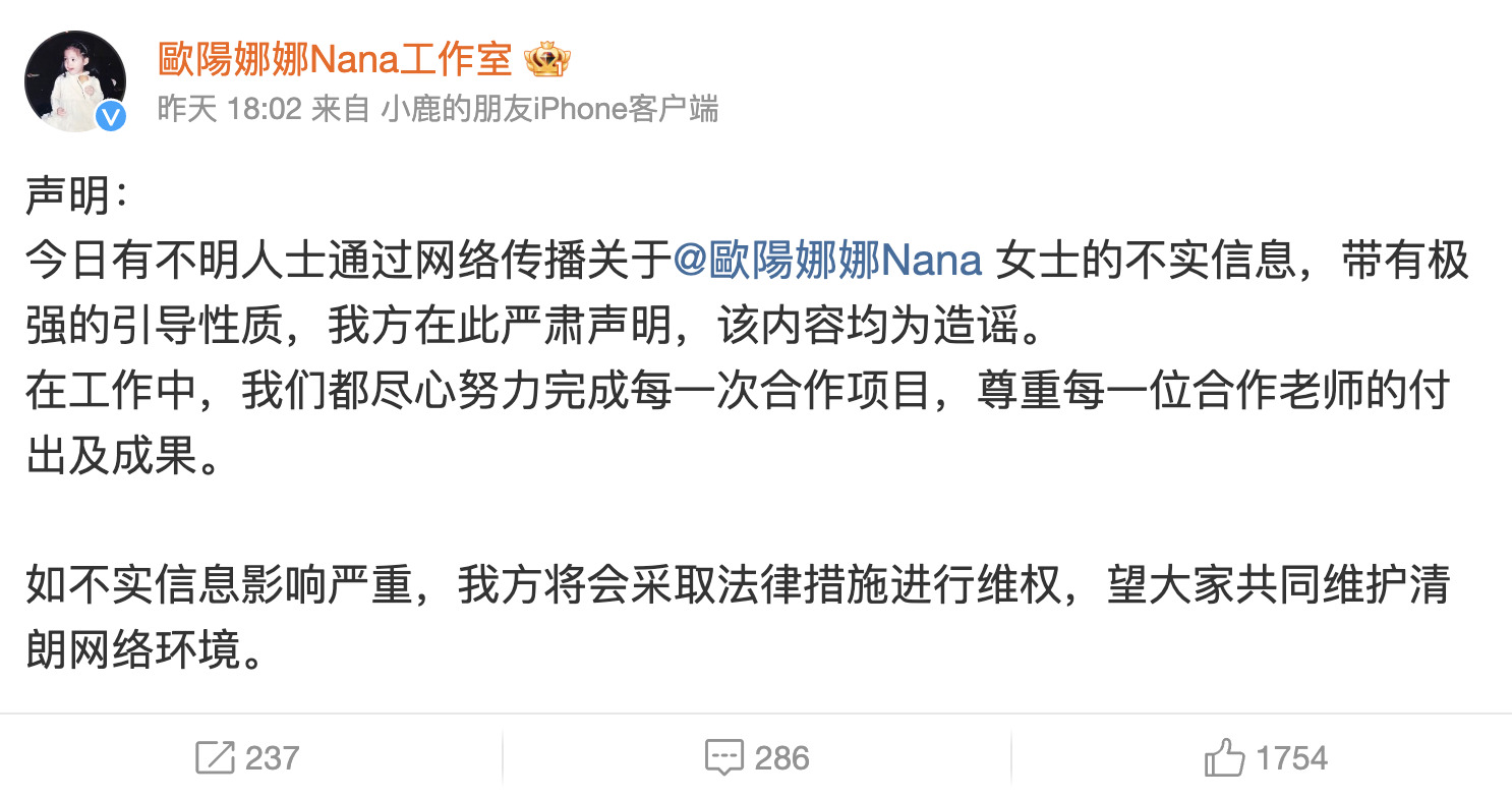 對此,歐陽娜娜工作室於微博發布聲明嚴厲否認,並譴責該爆料內容具有強烈的引導意味,是造謠不實消息,並強調:「在工作中,我們都盡心盡力努力完成每一個合作項目,尊重每一位合作老師的付出及成果,如有不實訊息影響嚴重,我方將會採取法律措施進行維權。」