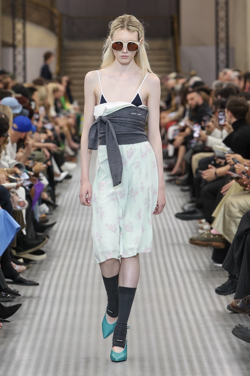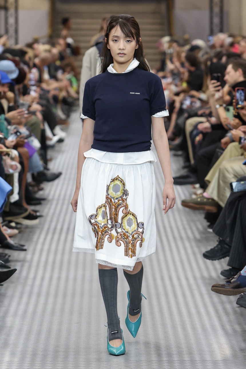 如果說 2024 秋冬系列提出的服裝語彙橫跨生活體驗的全貌,那麼 Miu Miu 2025 春夏系列則演變為將年輕時代視為絕對真實的時期。在學會偽裝之前,每個人對自己、對理想都是誠實的。作為對過度刺激與過度資訊時代的反應,簡約的服裝可以提供清晰與精確,並作為一種誠實的性格框架。