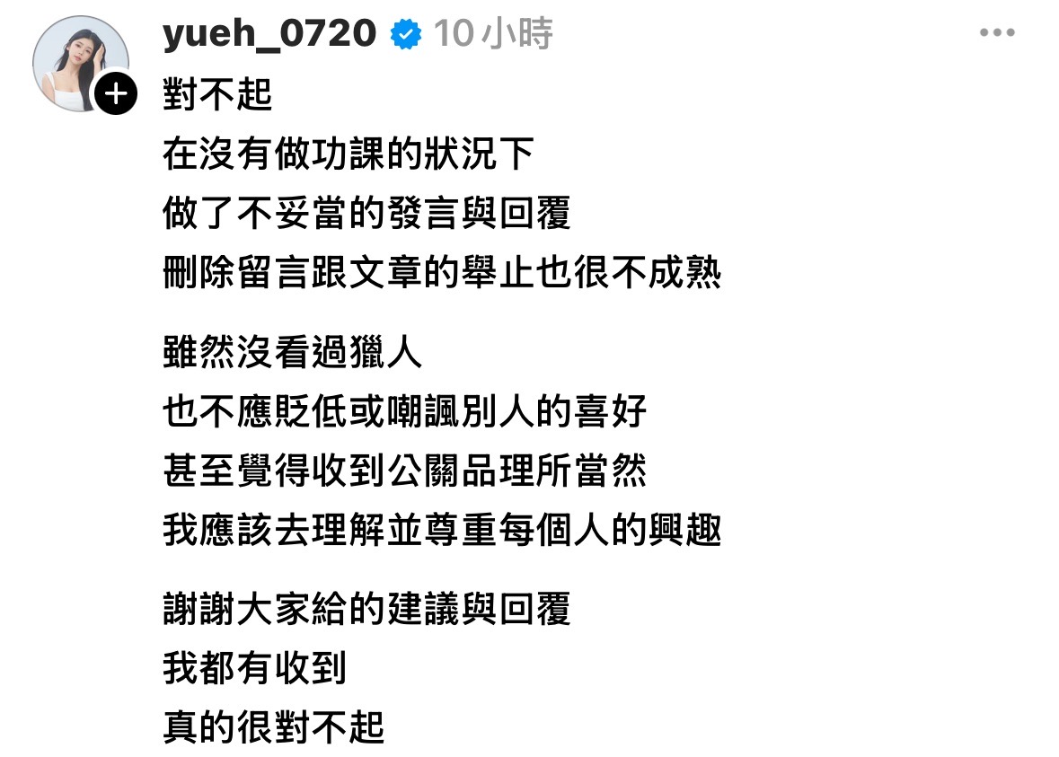 許悅一開頭就先釋出歉意:「對不起,在沒有做功課的狀況下,做了不妥當的發言與回覆,刪除留言跟文章的舉止也很不成熟。」接著表示即使沒看過《獵人》,也不該貶低或嘲諷他人喜好,「我應該去理解並尊重每個人的興趣。」坦承已認知到自己的錯誤,最後她也再次道歉:「謝謝大家給的建議與回覆,我都有收到,真的很對不起。」