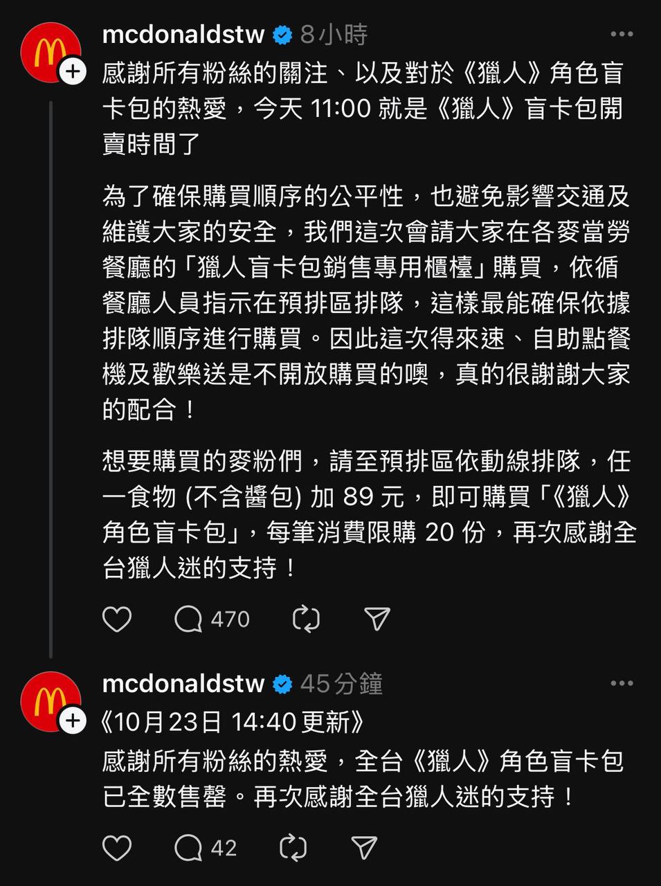 看更多:麥當勞宣布《獵人》盲卡包全台售空!大批網友崩潰表示:「今天杰倫跟獵人都搶不到...」