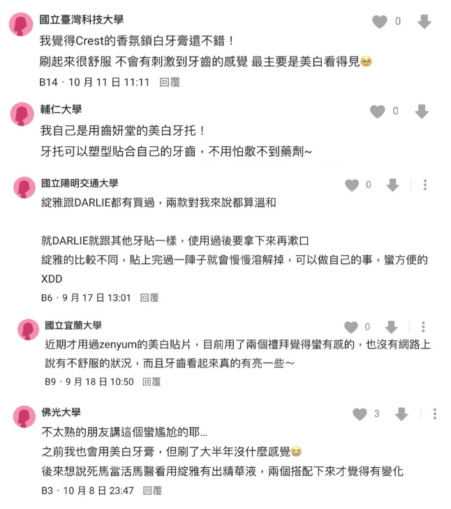 除了該篇貼文之外,在Dcard上也有其他篇文章在討論推薦的齒美白產品,其中最多討論度的就是:Crest美白牙膏、Zenyum綻雅亮白貼片和亮白精華液。前者推薦做過冷光或是美白牙貼再搭配使用,也是許多網友使用過的美白牙膏中清潔力最強的,但不太會有敏感問題。而Zenyum綻雅亮白貼片最大的優點是只要撕開貼上牙齒後,產品就會自動溶解完全不需額外的步驟,完全是大忙人、懶人的美白救星。