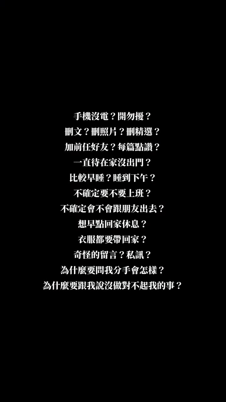 NanaQ一一列出多項曾經自己抱有疑問的事情,包括手機沒電、開勿擾、刪文刪照片、加前任好友並每篇文都點讚、不確定要不要上班、比較早睡、想早點回家休息...等,不禁懷疑前任到底有沒有愛過她。