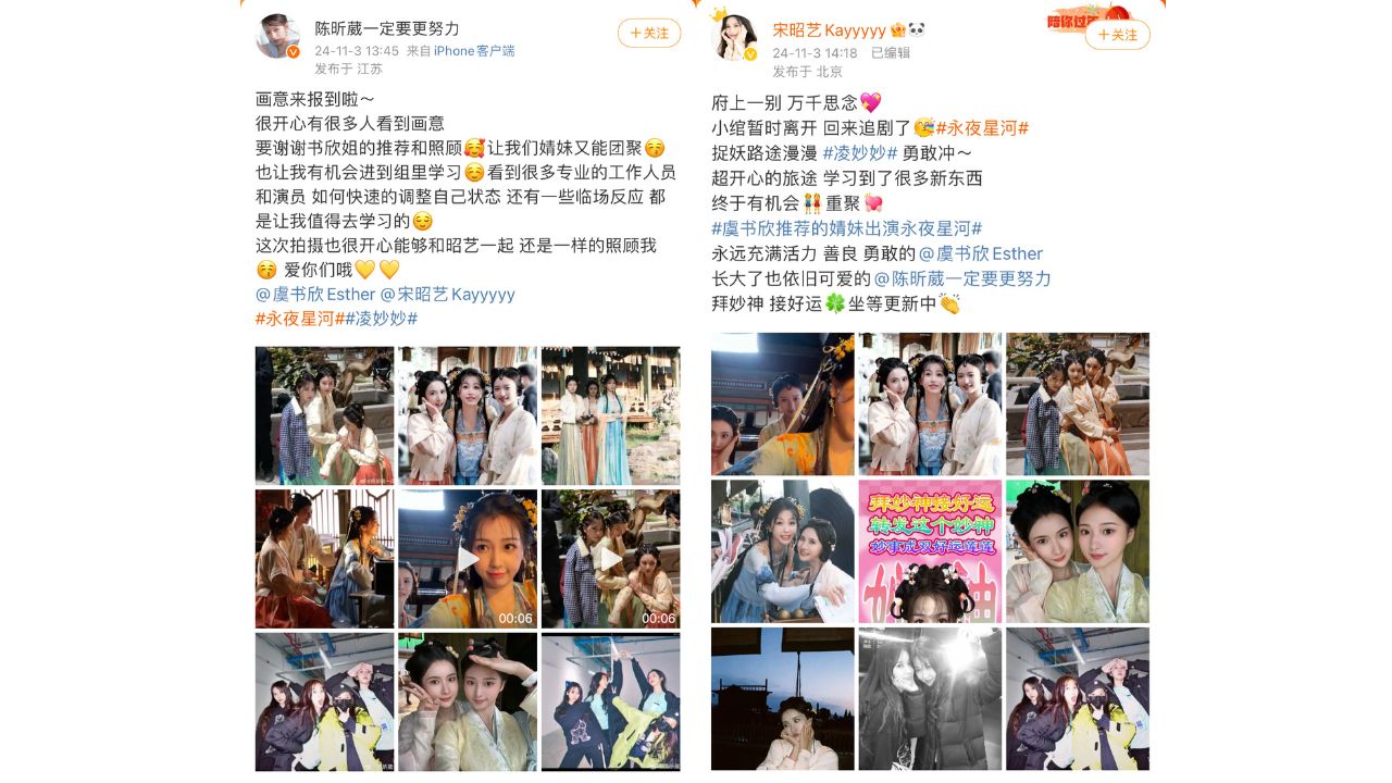 除了男主丁禹兮與虞書欣已是二搭的交情外,劇中也更暗藏不少虞書欣的人脈線,在劇中擔任虞書欣在身邊的兩位貼身丫鬟「小綰」、「畫意」的兩位演員正是虞書欣的好友,分別是宋昭藝和台灣新生代演員陳昕葳,兩人也在劇組殺青後發文,表示她是在虞書欣引薦下參與了本次拍攝,並在文中寫下「謝謝書欣姐的推薦和照顧,讓我們婧妹又能團聚」,除此之外,劇中的男二「楊仕澤」過去也曾與丁禹兮、虞書欣共同主演《月光變奏曲》,整個劇組可說是老朋友大集合,難怪彼此之間默契好的沒話說。