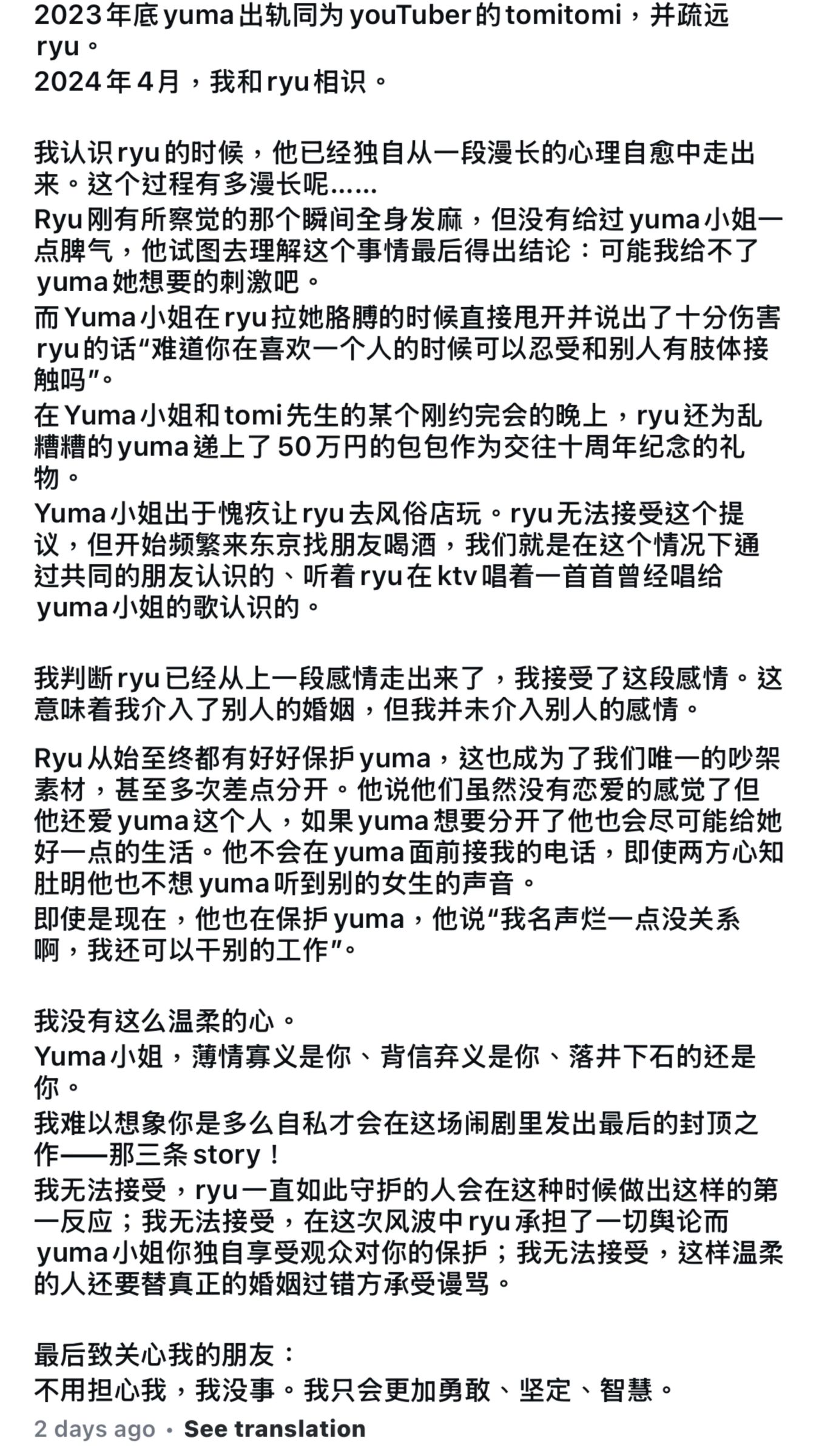 事情延燒數日,故事中的男主角終於現身,連續發出兩篇長文,坦言去年12月就發現Yuma的背叛、出軌,而今年4月才認識女畫家,「一開始約好不能越軌。但我還是屢次犯規。我不由自主的把感情投入在她身上。」並坦言最後發文中的「大好き!」是他用女畫家手機打的。最後Ryu拜託粉絲不要攻擊兩位女性,「整個事情的大流程裡,惡的源頭還是在我這。我這邊隨時歡迎大家的情緒發洩。