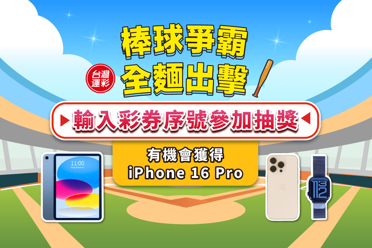 「棒球爭霸 全麵出擊!」抽獎活動即日起至11/30止,邀請所有熱愛棒球的朋友一起參加,在活動期間,只要到台灣運彩投注站購買實體彩券(不限玩法、不限球種),每張投注滿300元以上就能登錄活動頁面參加抽獎,還有機會獲得限量小王子麵!「日日抽」送出超過6千份全家虛擬禮物卡,「週週抽」更有Apple Watch和iPad讓你帶回家!11月底的「滿月抽」更是吸睛,終極大獎最新款iPhone 16 Pro共6支,讓人心動到不行!活動總共超過8000個獎項,是不是迫不及待要試試手氣了呢?