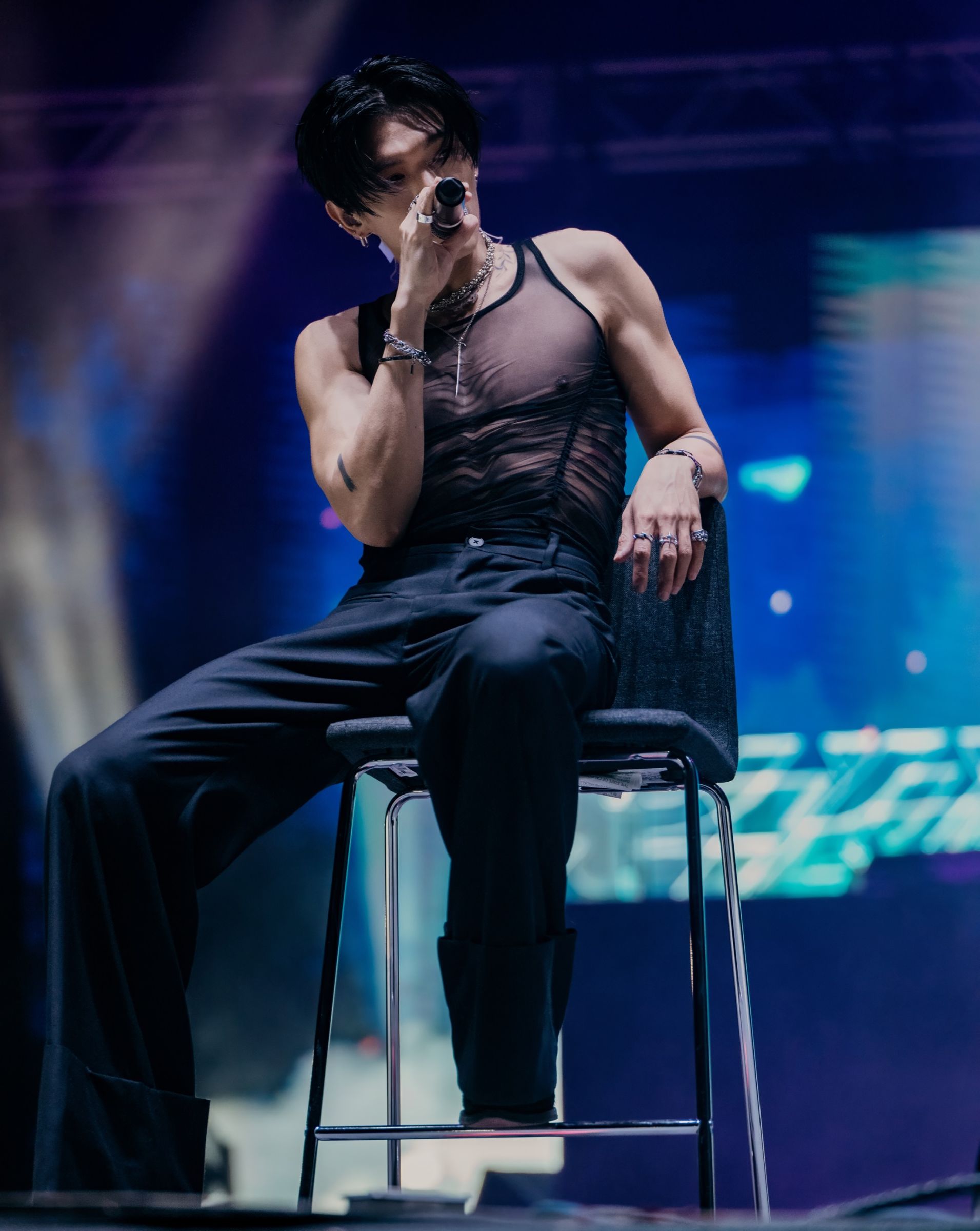 KIRE凱爾把世界巡演當成大型個人才藝時尚秀,有著超強「衣Q」的他為了配合各地的文化特色,都搭配了不同造型來增天現場表演魅力,其中如香港場就現場辦起校園舞會派對穿搭上校服與歌迷同歡,讓全場洋溢復古青春氣息,而到了美國場則整個人「大解放」,不僅個性皮衣皮褲上身,連造型都走最前衛時尚的「中空」性感風大秀六塊肌,大膽浮誇配件完全呼應他充滿挑逗及讓人臉紅心跳的表演風格!