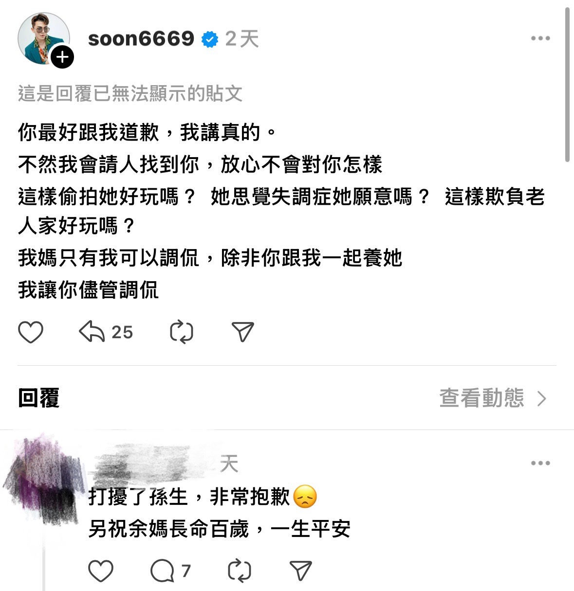 事實上,孫生平時在螢幕上一向帶給大家活潑開朗開朗的形象,這次罕見在網路上發飆,可見該行為已踩到他的底線。對此,該網友已刪除貼文,並向孫生致歉:「打擾了孫生,非常抱歉,另祝余媽長命百歲,一生平安。」