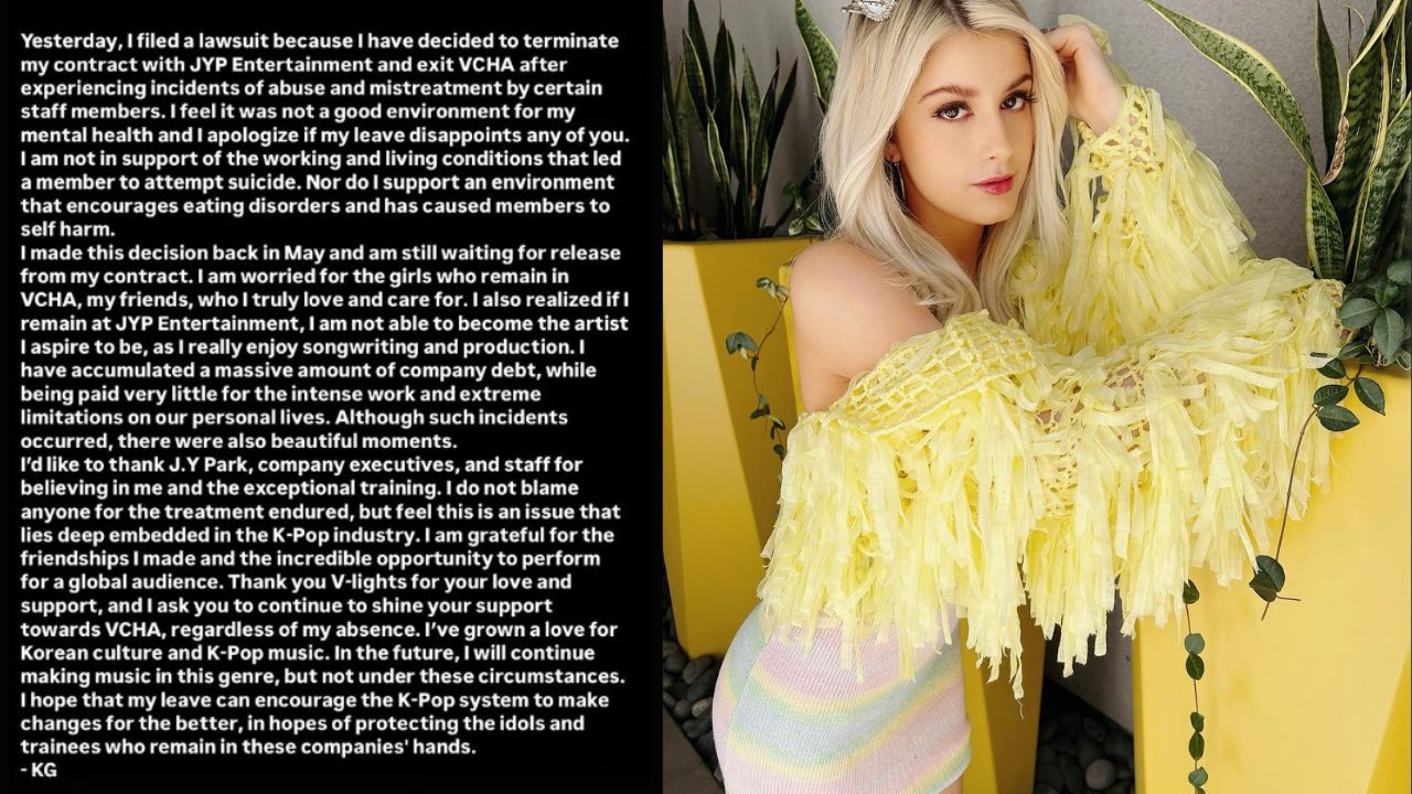 KG現年17歲,是團體內年紀最小的成員,12月8日她在Instagram上發文表示:「由於受到工作人員的虐待,我決定終止與JYP娛樂的合約,並離開VCHA。」她進一步指控:「我無法支持一個令成員產生自殺念頭的工作環境與生活條件,也無法認同導致飲食失調並讓成員自殘的氛圍。」對團隊的工作環境與管理方式提出了嚴厲批評。