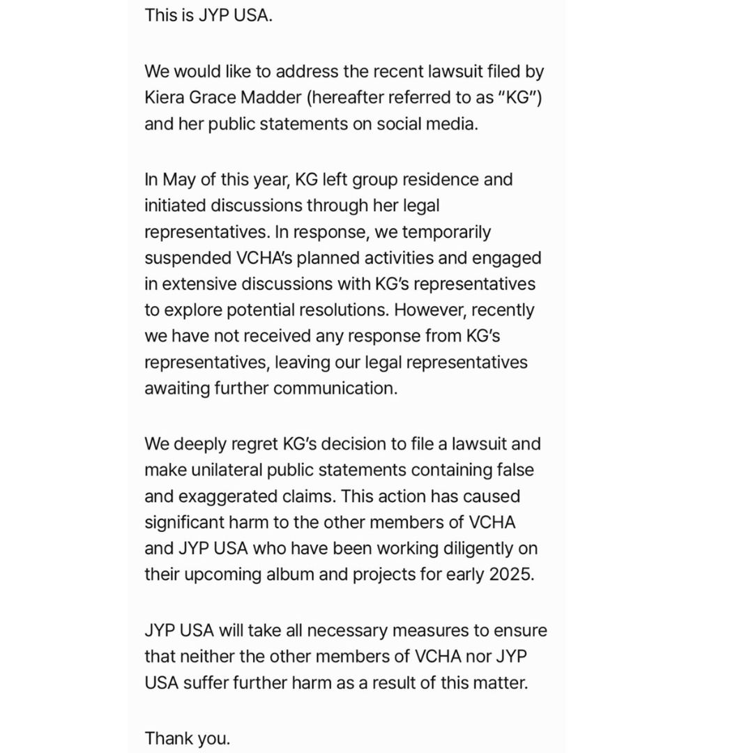 但對於 KG 指控遭「特定工作人員的虐待」的事件,今早(9日)JYP 美國分公司發表官方聲明,公司表示,對於 KG 的說法深感遺憾,並強調這些指控對 VCHA 其他成員及公司已造成重大影響,聲明中指出 KG 於今年 5 月離開團體宿舍後,通過法律代理人提出與公司協商的要求,基於此,公司一度暫停了 VCHA 的後續活動計劃,並與 KG 的代理人就多種解決方案進行了一系列討論,但近期並未收到 KG 方面對討論內容的任何回應,我方代理人也一直在等待對方的答覆。
