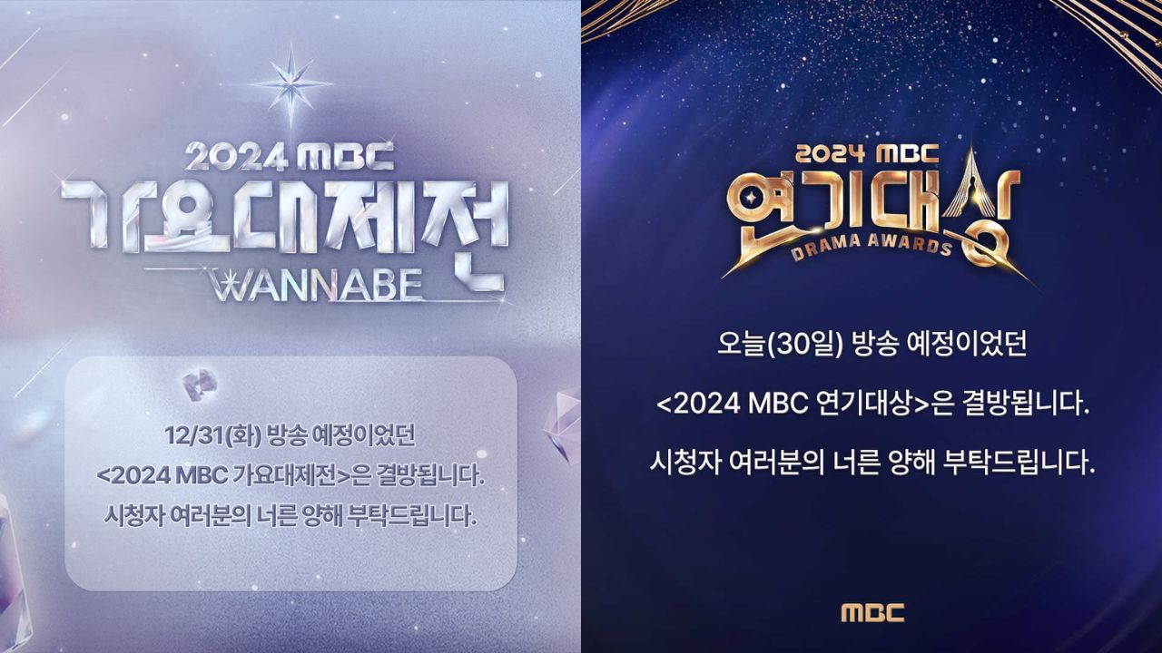 而 30 日取消直播的 MBC 演藝大賞宣布節目內容將以「預錄」方式,日後會公布播出日期,原訂今晚(12/31)舉行的 MBC 歌謠大祭典也確定取消直播,目前已經有多組歌手錄完表演舞台,但具有火、飛機元素的表演極有可能被刪減,演唱會播出日期同樣日後告知。