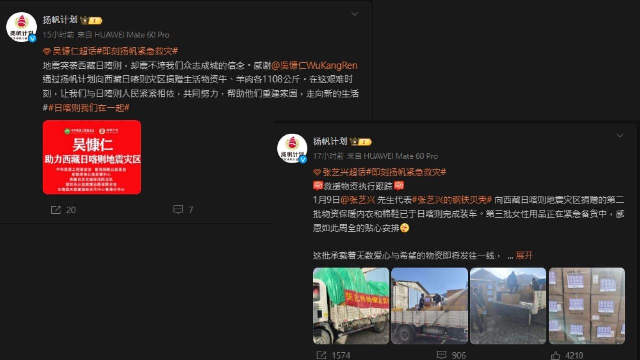 大陸微博名為「揚帆計畫」的帳號,從 9 日陸續分享捐款物資相關資訊,可見(G)I-DLE雨琦、舒華捐贈衝鋒衣及羽絨服希望能協助賑災外,張藝興也特別捐上保暖內衣和棉鞋等物資,吳慷仁也特別捐贈牛、羊肉各1108公斤,希望能夠幫助災戶度過難關。