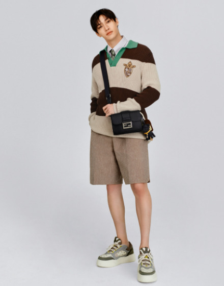 在官方照片中,Bang Chan以一身FENDI 2025年春夏男裝系列的完整造型亮相,包括啡色及奶白色條紋棉質針織上衣,綴以綠色翻領及FENDI紋章,搭配白色恤衫、綠色領帶,以及飾有明線的提花短褲和Selleria工藝製成的FENDI Force運動鞋。他手拿品牌經典的黑色Cuoio Romano皮革Baguette Double,以及飾有FENDI Crest紋章的黃色Cuoio Romano皮革Peekaboo Soft Small,兩者均繫上Ito小狗及雪糕造型的趣怪吊飾,將整體造型昇華。來自FF及FENDI Hexagon兩個流行配飾系列的精品,包括戒指、耳環和手鐲,為Bang Chan的造型鍍上Gen Z年輕隨性的新世代魅力。