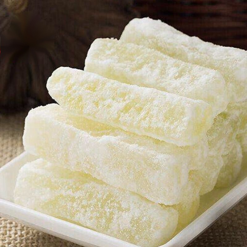 冬瓜糖條是早期因物資缺乏,過年時必備傳統零食,是將冬瓜去除外皮和瓢後,與大量砂糖一起熬煮,熬到收汁後將其烘乾,在外層裹上一層糖粉,香甜軟綿的口感,有著「甜蜜幸福綿延」的寓意。