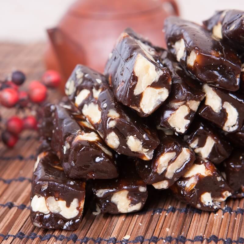 南棗核桃糕是先將麥芽、黑糖、鹽巴進行熬煮,隨後將棗泥餡、烏豆沙餡倒入攪和,最後再將烘烤的核桃加入熬成膏狀,待冷卻之後切成塊狀。濃厚的棗味深受長輩們喜愛,也象徵著「健康、吉祥」的寓意。