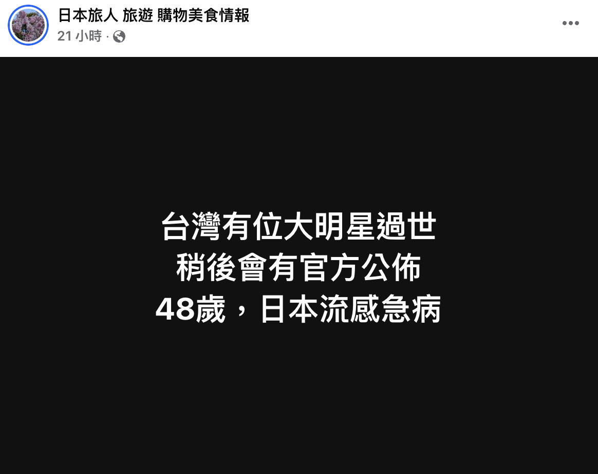臉書粉絲專頁「日本旅人旅遊購物美食情報」2日發文透露:「台灣有位大明星過世,稍後會有官方公布,48歲,日本流感急病。」並透露該女星身份線索:流星花園年代、女性、已婚、與外國人結婚,種種暗示指向大S。