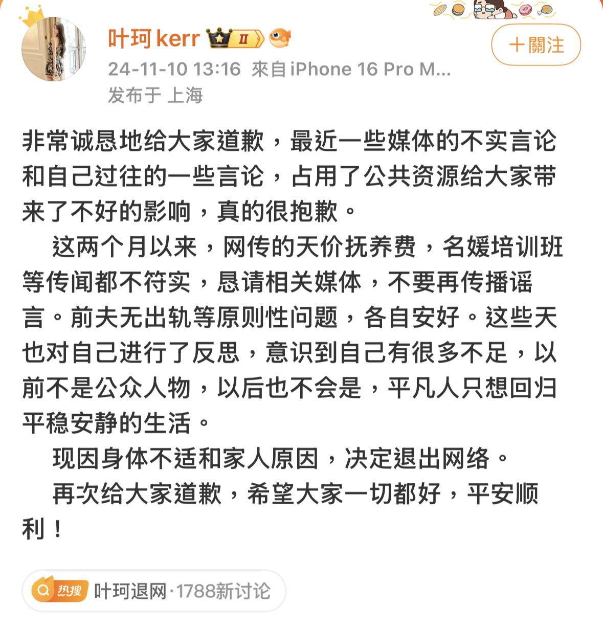 中國男星黃曉明與前妻Angelababy育有一個兒子「小海綿」,2022年離婚後於2024年認愛網紅葉珂,不過女方隨後卻頻頻捲入各種負面風波並宣布「退網」,而黃曉明也刪掉了當初的認愛文,讓外界猜測兩人是否已分手。情變消息未得到證實的情況下,近日又傳出葉珂已生下女兒的消息,引發熱議。