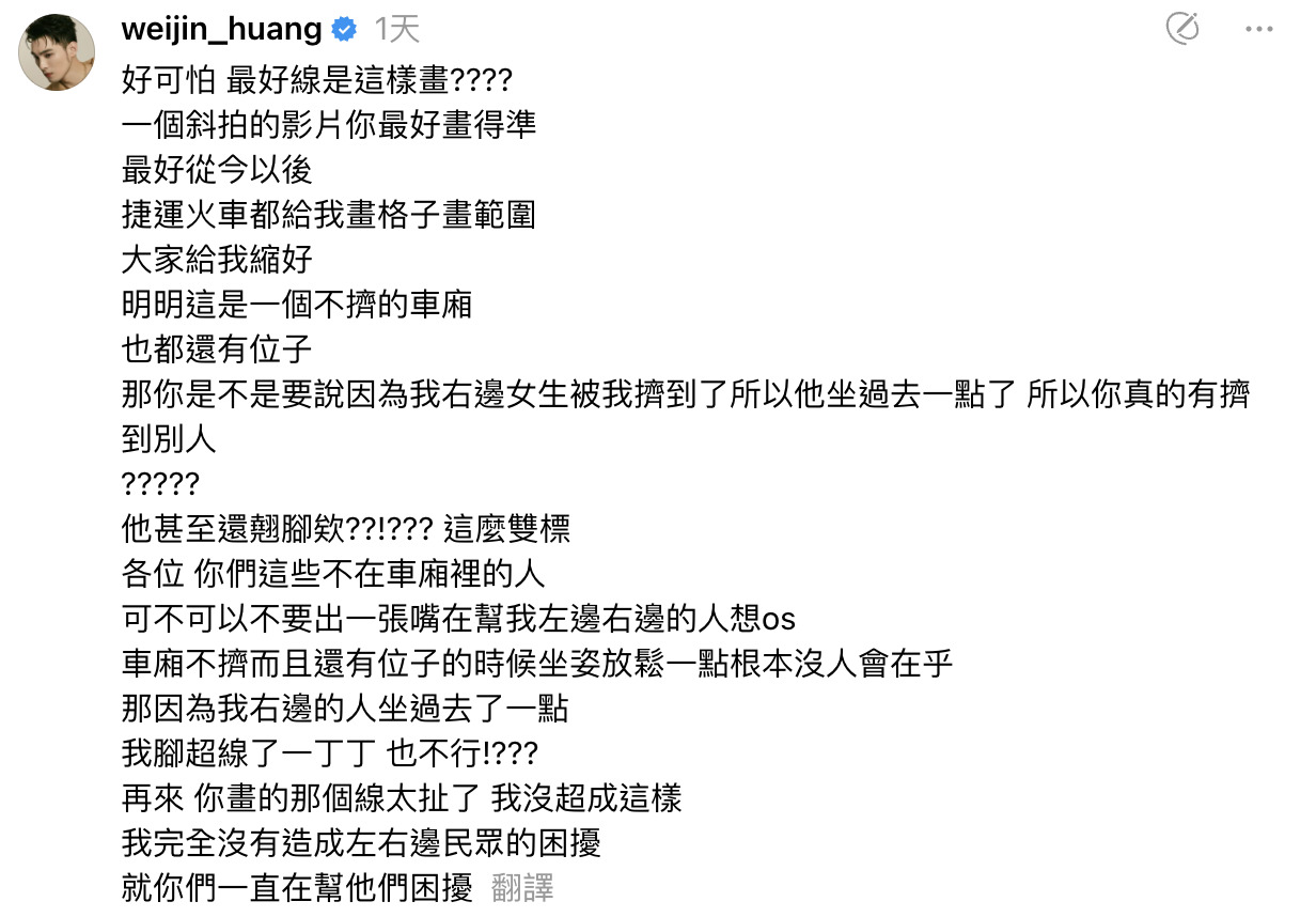 事件起源於有一名網友在Threads分享火車上巧遇偉晉的經歷:「超想問是不是他,但因為社恐不敢開口。」沒想到片段流出後就有酸民認為黃偉晉的雙腿開太開,擠壓到隔壁女生的座位空間,甚至「加工」畫了一條線來證實黃偉晉的確已超線,引發熱議。