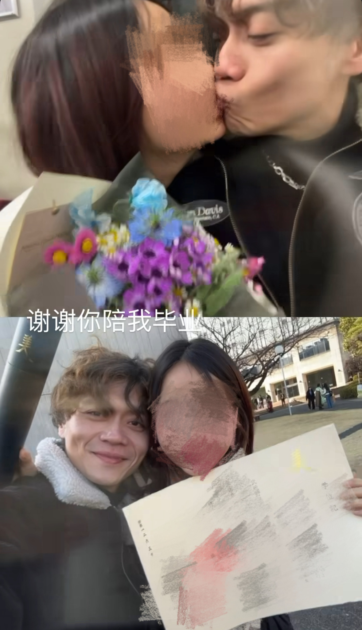 女畫家在限時動態曬出自己開心拿著畢業證書的影片,兩人臉貼臉開心自拍,另一則影片可見她手上拿著一束花,Ryu先是親吻她的臉頰,接著女畫家便轉過頭與男方親密接吻,幸福感滿滿。