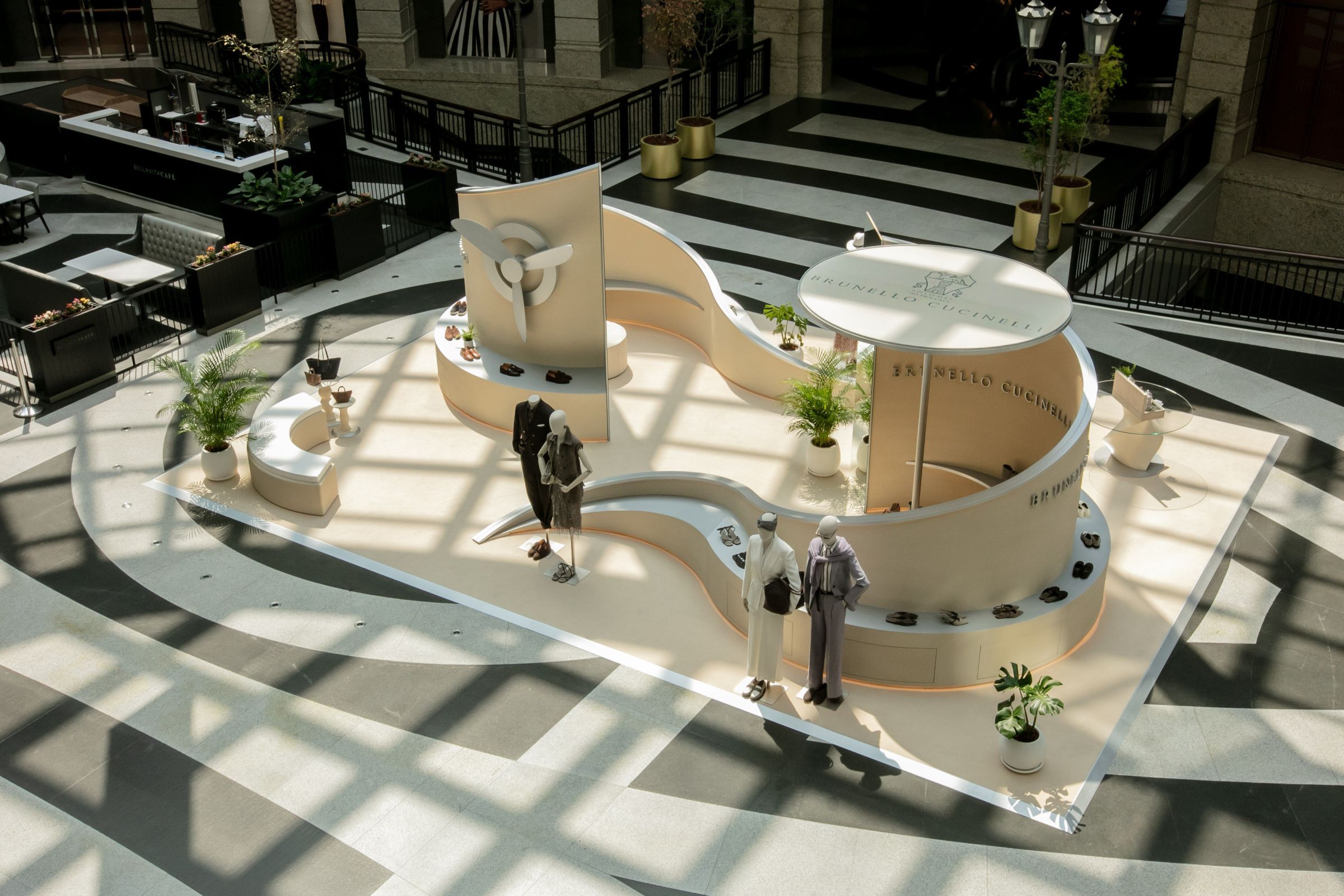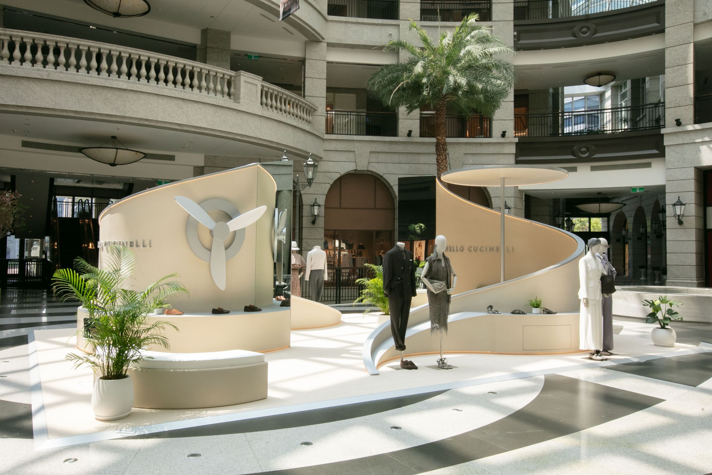 為完整呈現品牌春夏系列靈感,Brunello Cucinelli特別於3月26日至4月20日期間於台北Bellavita寶麗廣塲開設期間限定快閃店。由義大利設計團隊特別獨家打造的快閃店,承襲品牌優雅簡約的時尚風格,並注入源於春夏男女裝系列以「旅行」為概念的設計靈感,採用不規則圓弧形結構店裝設計,融合巨型螺旋槳裝置,在純淨柔和的米色調空間中,將男女服飾、包款、配件、香水、鞋履置於一室,體現品牌一貫沉靜雅致的美學素養,邀請消費者一同沉浸式探索Brunello Cucinelli最溫柔的低奢魅力。