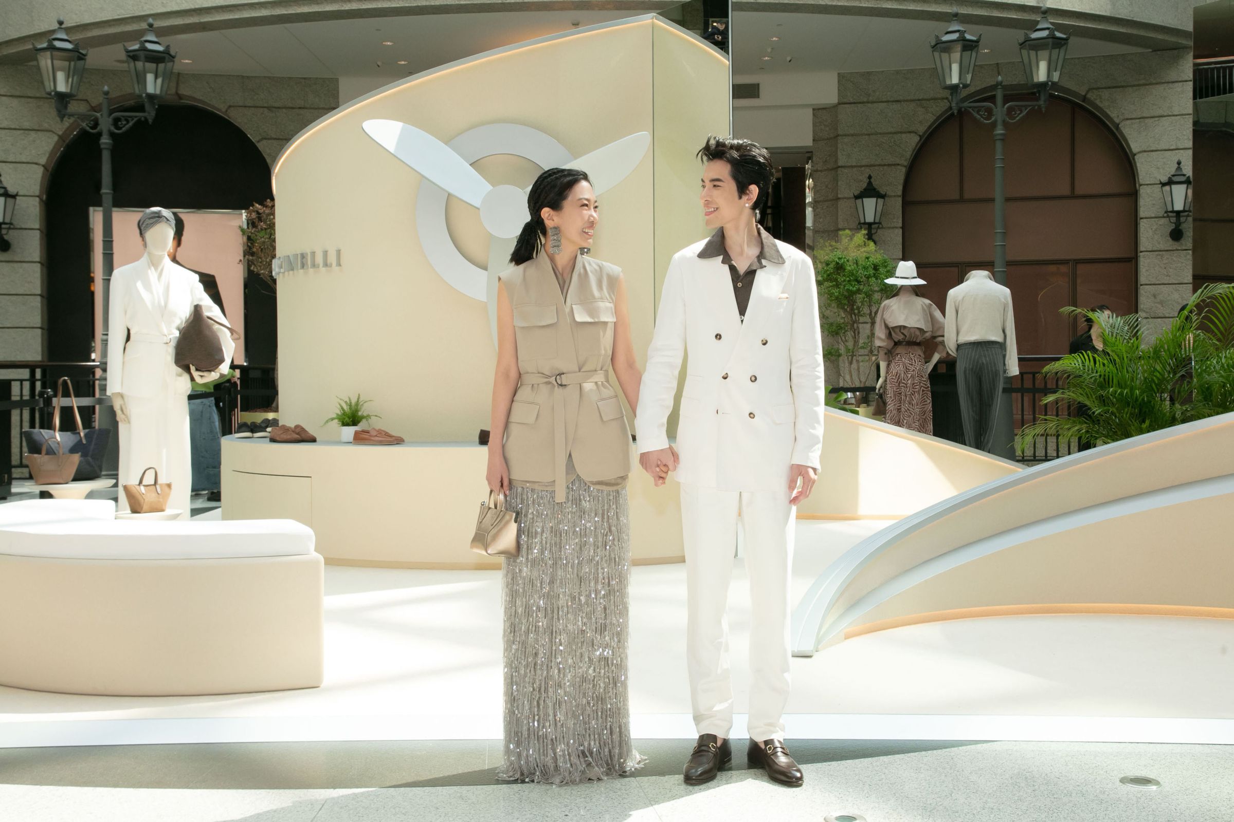 義大利高奢品牌Brunello Cucinelli於台北信義區Bellavita寶麗廣塲開設「ECHOES OF A JOURNEY 巡遊造響」期間限定快閃店,特別邀請到去年年底剛完婚的蕭敬騰與Summer夫婦驚喜合體現身3月24日的品牌開幕記者會。蕭敬騰穿著一身白色半雙排扣成套西裝,內搭深褐色古巴領襯衫,展現瀟灑與優雅兼具的義式風尚。Summer則是身穿一件沙丘色工裝背心搭配亮片流蘇瀑布長裙,率性中閃動搖曳生姿的女性氣質。兩人造型巧妙地融入大地色系相互呼應,展現衣著甜蜜小默契。