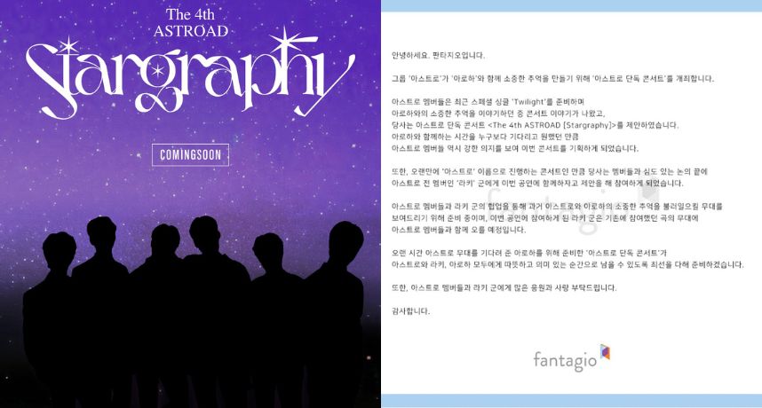 ASTRO歷經文彬驟逝後,團體感情堅定,當年 ROCKY 也抽空現身文彬的告別式可見情感深厚,如今團體睽違 3 年再辦演唱會,令粉絲欣喜外,也在今(14)日的聲明中寫道:「為了與 AROHA(粉絲名)共創珍貴回憶,ASTRO 將舉辦《The 4th ASTROAD [Stargraphy]》。」並再聲明中提到:「與 ASTRO 成員聊起與AROHA之間的珍貴回憶,也自然談到了演唱會的話題,成員們展現出比任何人都更期待與 AROHA 相聚的強烈意志,最終促成本次演唱會的企劃。」