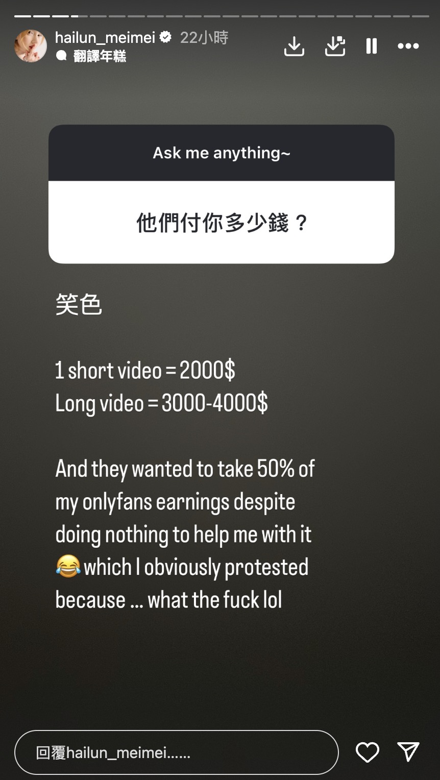 接下來海倫一口氣爆了許多《臺灣尋奇》的黑料,包括:「《臺灣尋奇》給她的片酬短影音只有2000元,長影音則是3、4000元。」並補充表示自己一開始在英國的時候就在經營OnlyFans,但因為粉絲不多而開始加入《臺灣尋奇》增加自己曝光的機會。後續《臺灣尋奇》的老闆承諾會幫助海倫讓她的OnlyFans事業做起來,不過代價是要讓公司抽成50%!