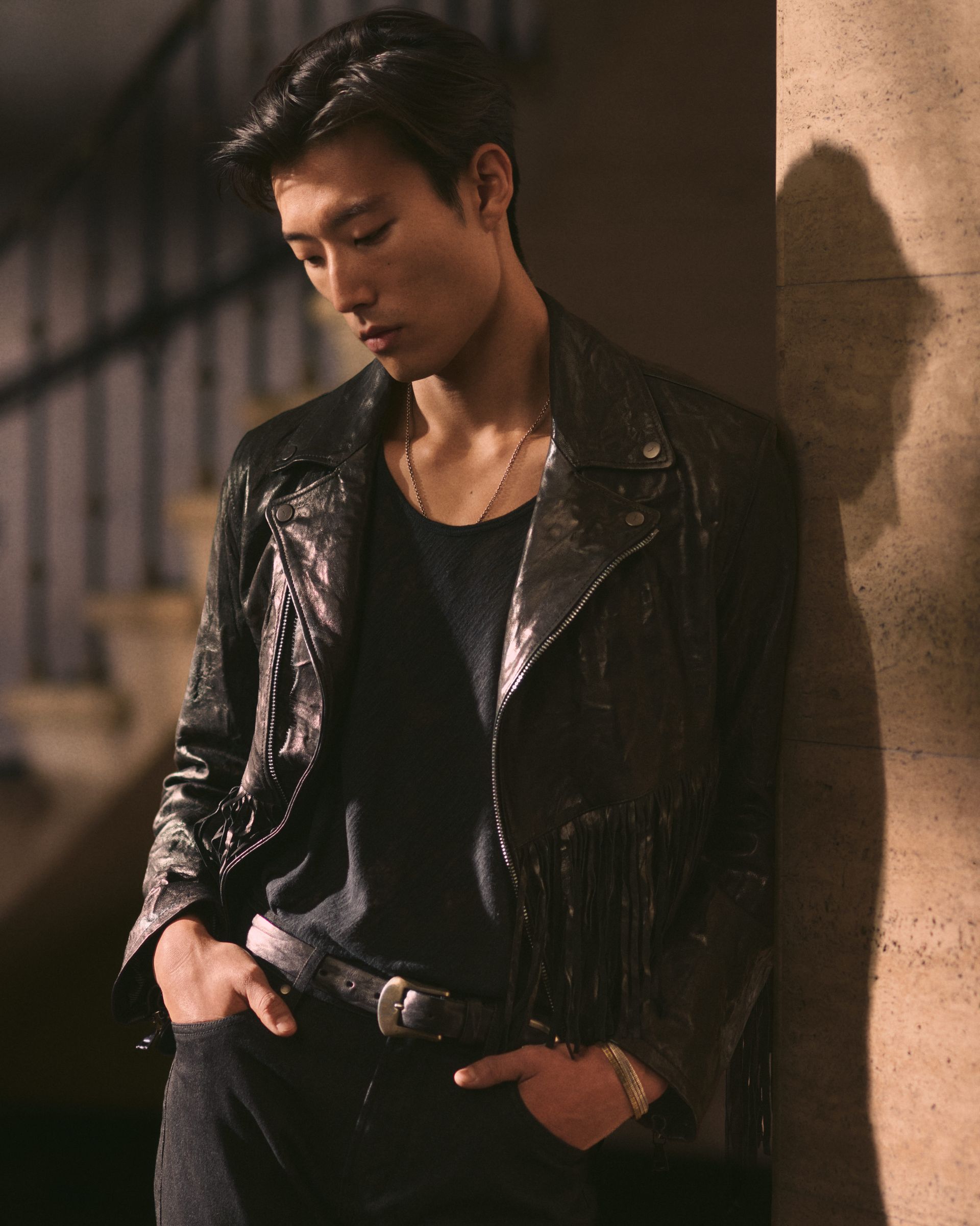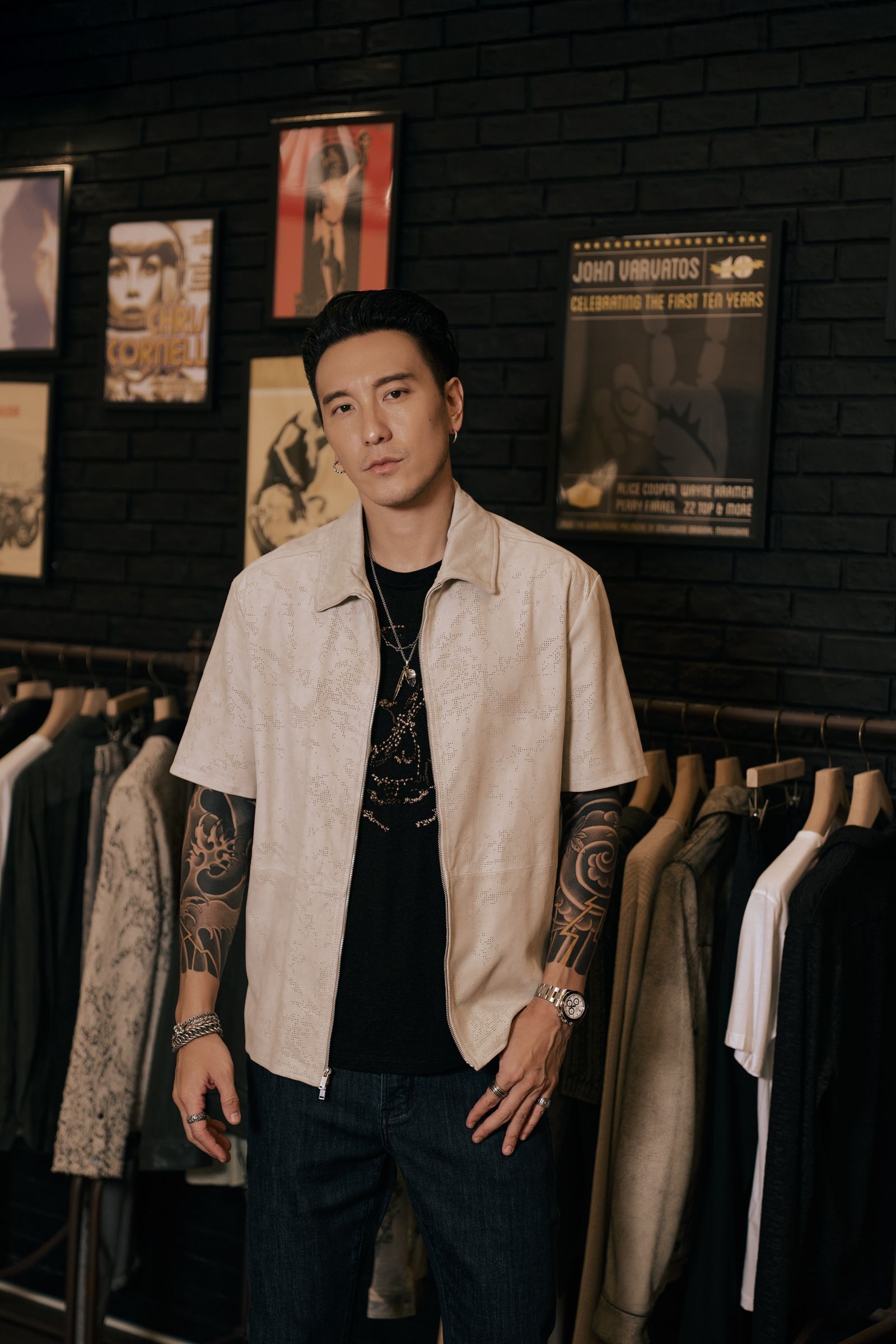 另一套則以染色皺褶工藝打造的紐西蘭羊羔皮夾克,內搭復古菱格針織衫及J704 修身款水洗牛仔褲。輕盈柔韌的皮革結合摩托車夾克的經典輪廓與自然紋理,與內搭粗紗質感形成層次對比,演繹搖滾奢華風尚之餘,彰顯自由不羈態度。王陽明表示,一直都很關注John Varvatos,無論是與 Converse 的聯名系列,還是服飾、飾品及包款,都展現出品牌一貫的前衛風格與精神。從面料選擇到工藝細節皆精緻講究,呈現低調卻不失個性的紳士品味。
