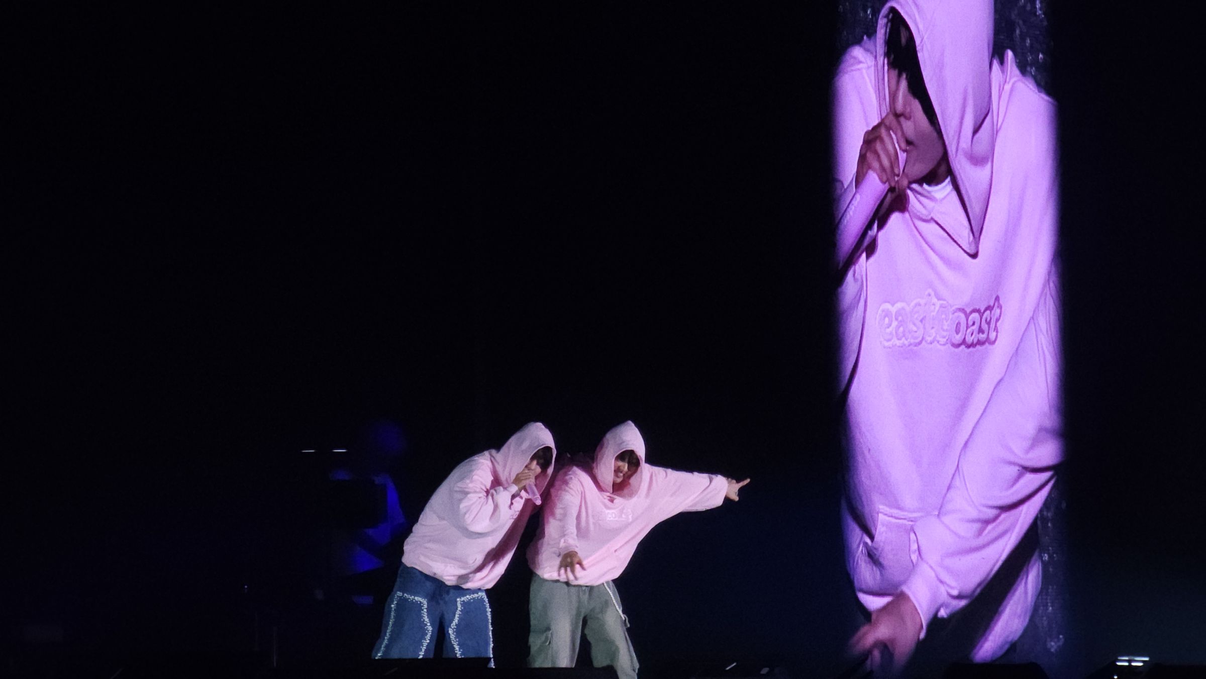 有趣的是,當晚東海身穿帥氣全白西裝,如同白馬王子,而銀赫則穿著休閒的粉紅帽T,形成強烈對比。銀赫笑虧:「我以為東海是開場穿白西裝,這個階段應該要換成這件(帽T),所以特地搭配!」聽完銀赫的抱怨,東海也立馬動身表示自己「立刻換」,互動笑翻全場。
