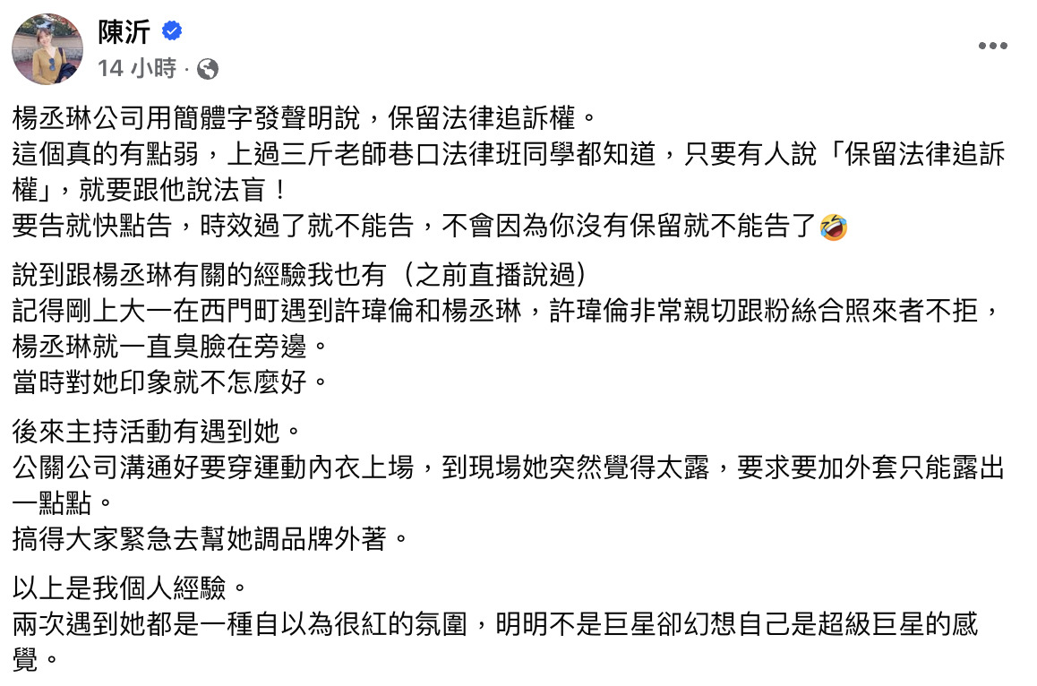女星楊丞琳近日遭Makiyo爆料「紅了就裝不認識」,引發外界熱議。對此,楊丞琳隨即透過社群平台限動回應,強調該言論為「惡意造謠」。她的工作室也在微博發布聲明,表明對於不實指控保留採取法律行動的權利。對此,網紅陳沂也發表自己的看法,並分享曾經與楊丞琳接觸時的經驗,直言:「自以為很紅」。