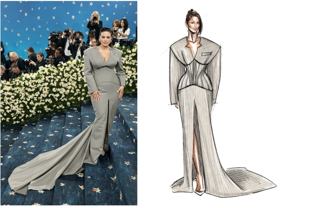 百老匯新生代先鋒、名模、演員與歌手Ashley Graham,以一襲展現力量與美感的BOSS訂製造型征服紅毯。靈感源自90年代BOSS經典權力套裝,造型以誇張鮮明的全襯式剪裁肩線與胸型、反折翻領設計與深V領口為亮點,自腰臀處以貼身剪裁向下自然延展為曳地裙擺,營造出靈活流動的優雅姿態。禮服採用灰色變形細條紋羊毛製成,此面料曾於 BOSS 2023 秋冬時裝秀上亮相,外搭同款面料的束身結構馬甲,勾勒出充滿戲劇張力的沙漏型曲線,展現現代女性優雅與力量的完美平衡。
