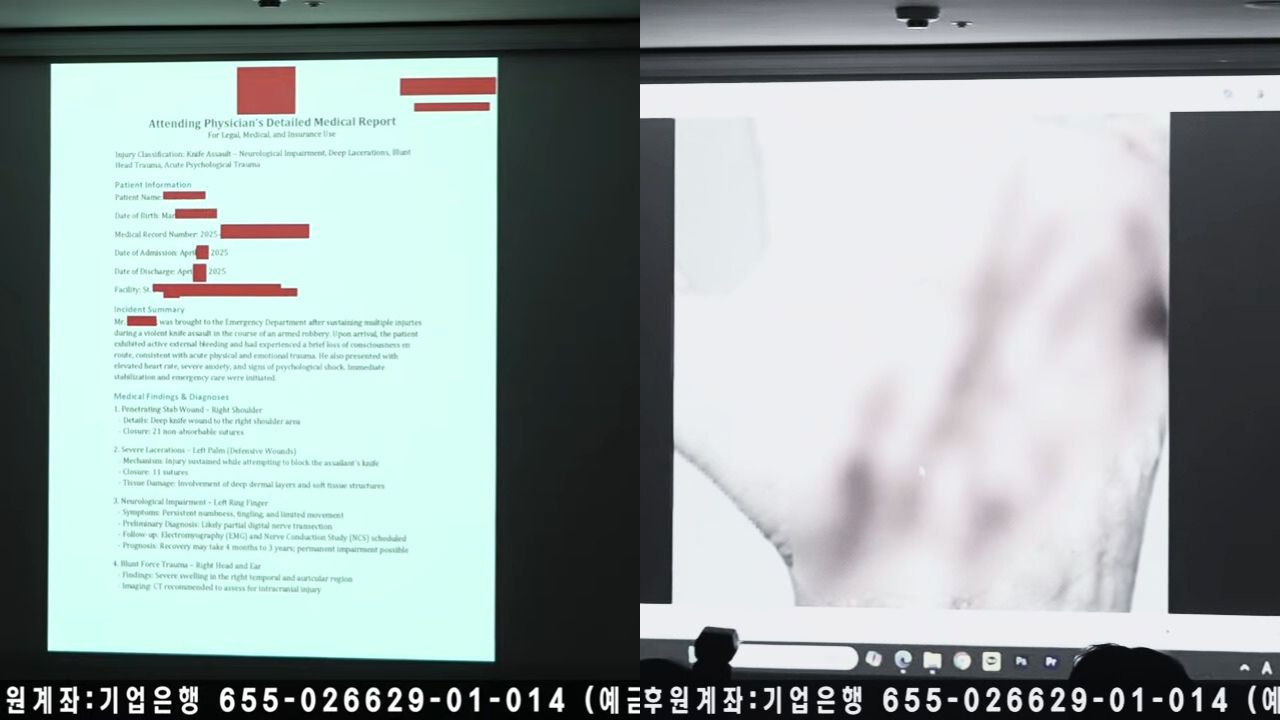 記者會上,《橫豎研究所》公開舉報人的醫療診斷書。傷者頸部與右肩遭深層刀傷縫合21針,左手掌有大片創傷縫了11針,左手無名指重傷,右側頭部與耳朵也嚴重受創,合計共縫32針,還伴隨腦震盪症狀,並公開了部分傷勢照片,初步調查顯示,襲擊者為一名剛入境美國的朝鮮族人士,同行者則是同樣近期入境的韓國人。目前案件已由美國聯邦調查局(FBI)接手,舉報人家屬因擔憂再次受襲,決定提前公開部分錄音內容。