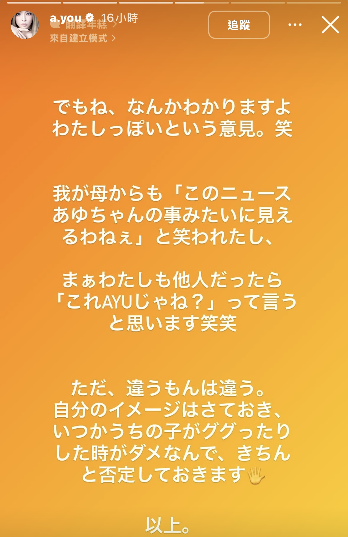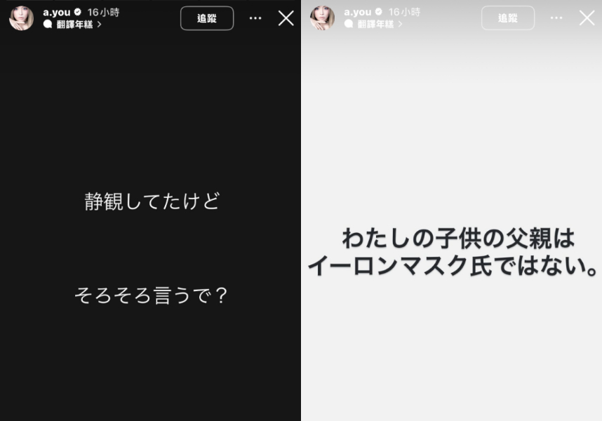 濱崎步一連發布三則限動回應風波,首先表示:「我一直保持緘默,但現在應該要發聲了。」緊接著明確澄清:「我小孩的生父不是伊隆・馬斯克先生。」最後她也寫下一大段文字,再次表達自己的立場。